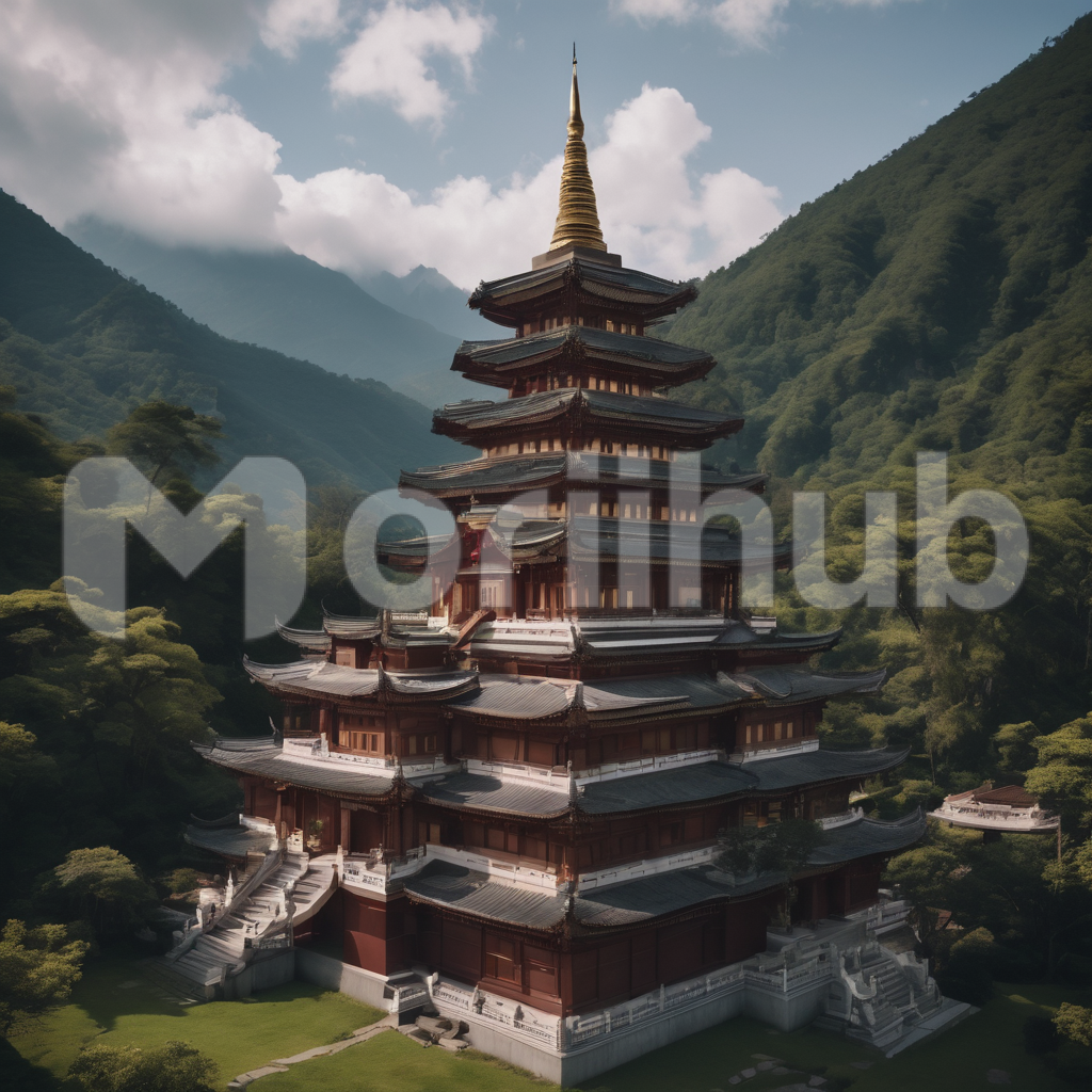 Amidst verdant greenery, a temple stands with solemn grace, its intricate architecture adorned with vibrant hues. Sparse clouds drift lazily across the azure sky, casting fleeting shadows upon the tranquil scene. Surrounding trees sway gently in the breeze, their lush foliage adding to the temple’s serene ambiance. In this picturesque setting, nature’s embrace enhances the temple’s sanctity, creating a harmonious union of spiritual tranquility and natural beauty.
