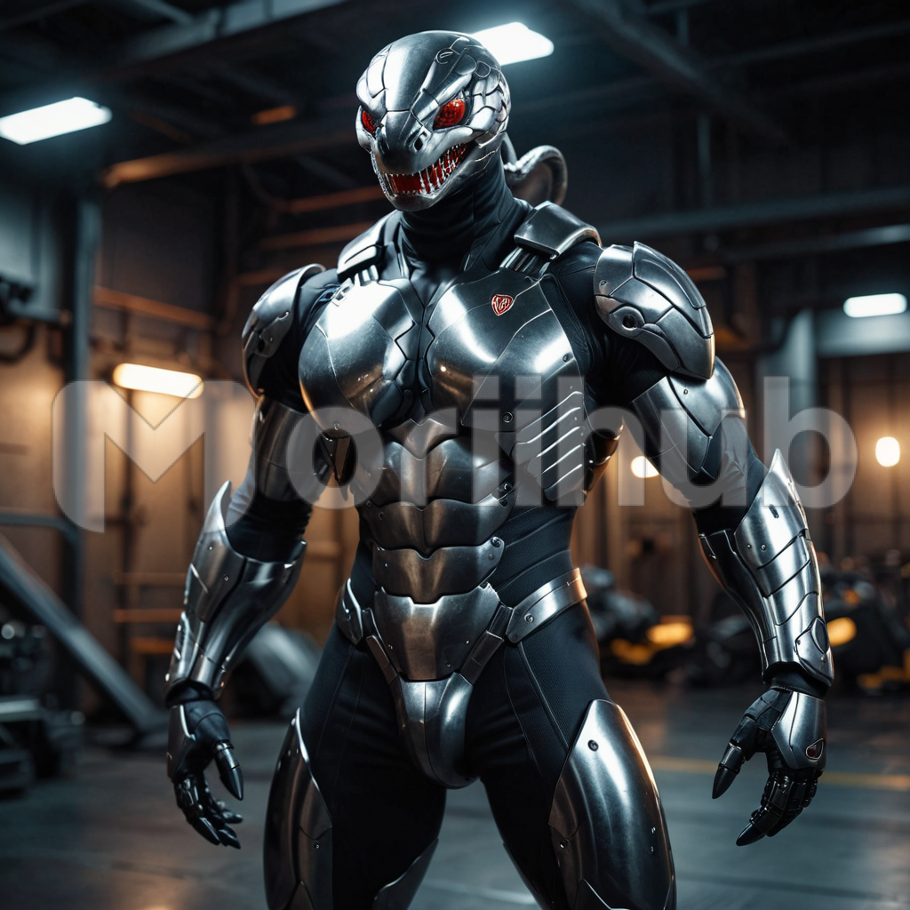 A robot stands sentinel, its form a sleek fusion of metal and innovation, its head fashioned in the likeness of a serpent. With eyes that gleam like polished onyx, it surveys the world with a calculated gaze, sensors attuned to every movement. Despite its artificial nature, there’s an undeniable sense of life in its design, a testament to the ingenuity of its creators and the fusion of technology and nature.