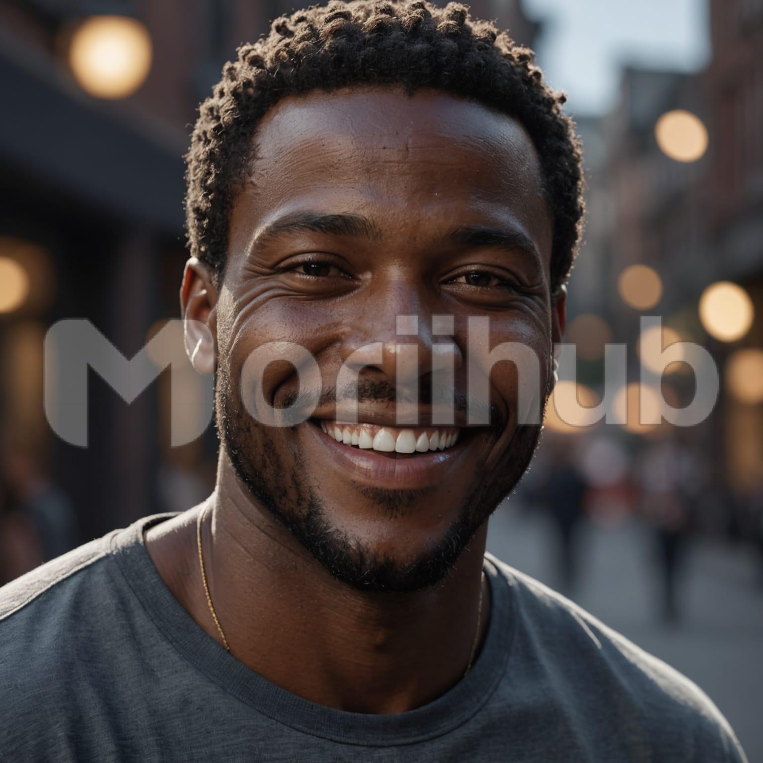 An ebony man stands smiling with short dreadlocks framing his face. His radiant smile showcases his white teeth, creating a striking contrast against his dark skin. He exudes a laid-back vibe, with his eyes sparkling with genuine joy and deep laugh lines suggesting a life filled with happiness. Behind him, the people blur into the background, making him the focal point. His warm and inviting demeanor shines through, as if he’s just heard something delightful, radiating positivity amidst the bustling crowd.