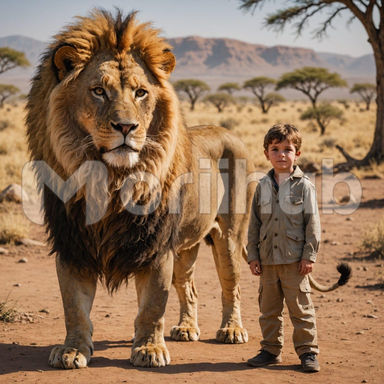 A brave boy stands fearlessly in front of a lion, embodying courage and determination. The lion, with its majestic presence, appears calm yet powerful. The boy’s unwavering stance reflects his bravery, as if he’s unshaken by the immense strength of the wild creature in front of him.