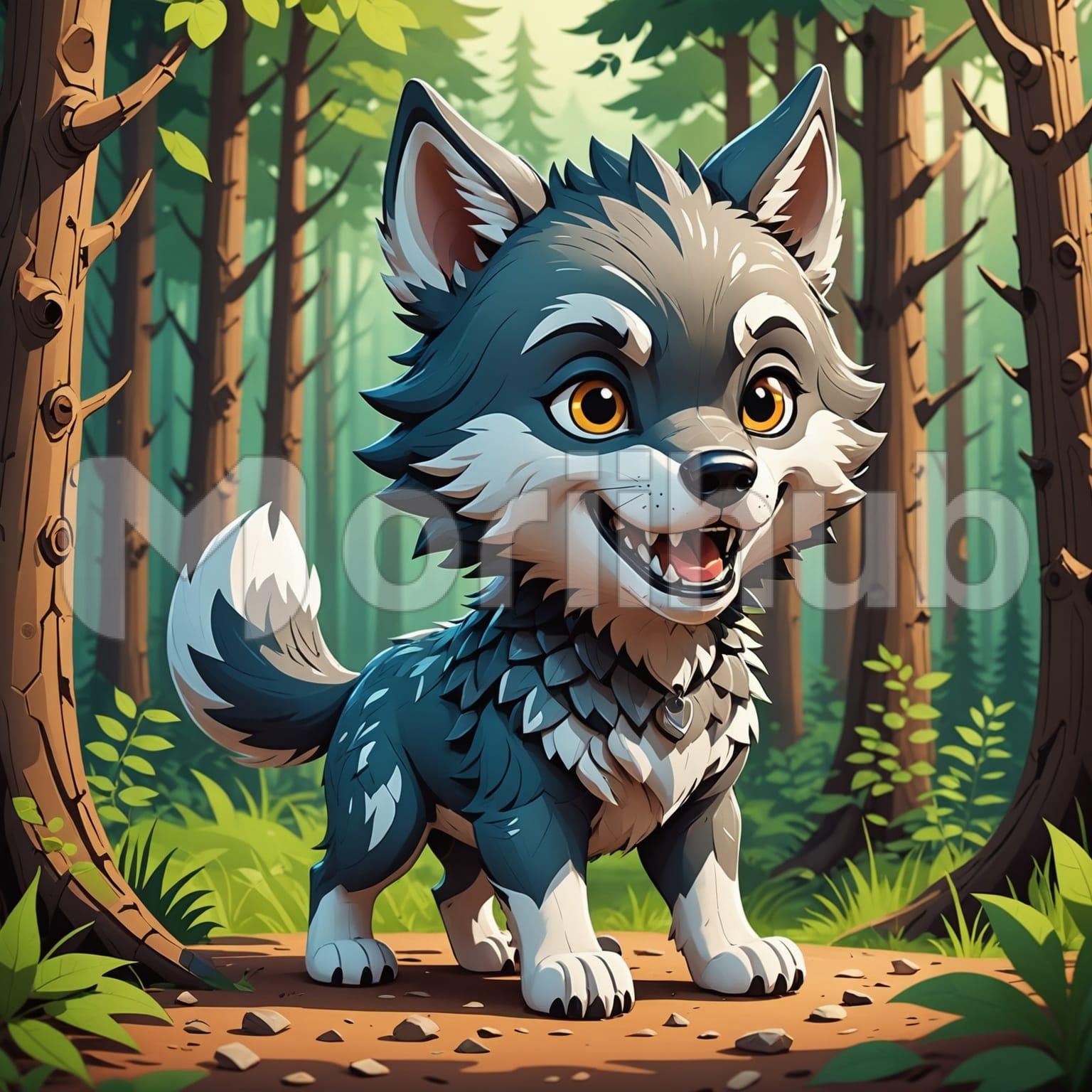 A cartoon wolf walks through the woods, its body angled as it moves with a steady pace. The fur is cleanly outlined, with a bushy tail trailing behind. Its ears point upward, and its eyes face forward, calm and alert. Trees rise around it, spaced to keep the scene open. Small rocks and patches of grass scatter across the forest floor. The wolf’s expression is neutral, neither tense nor playful. One leg lifts mid-step, the rest grounded, giving the sense of quiet movement through the still woodland setting.
