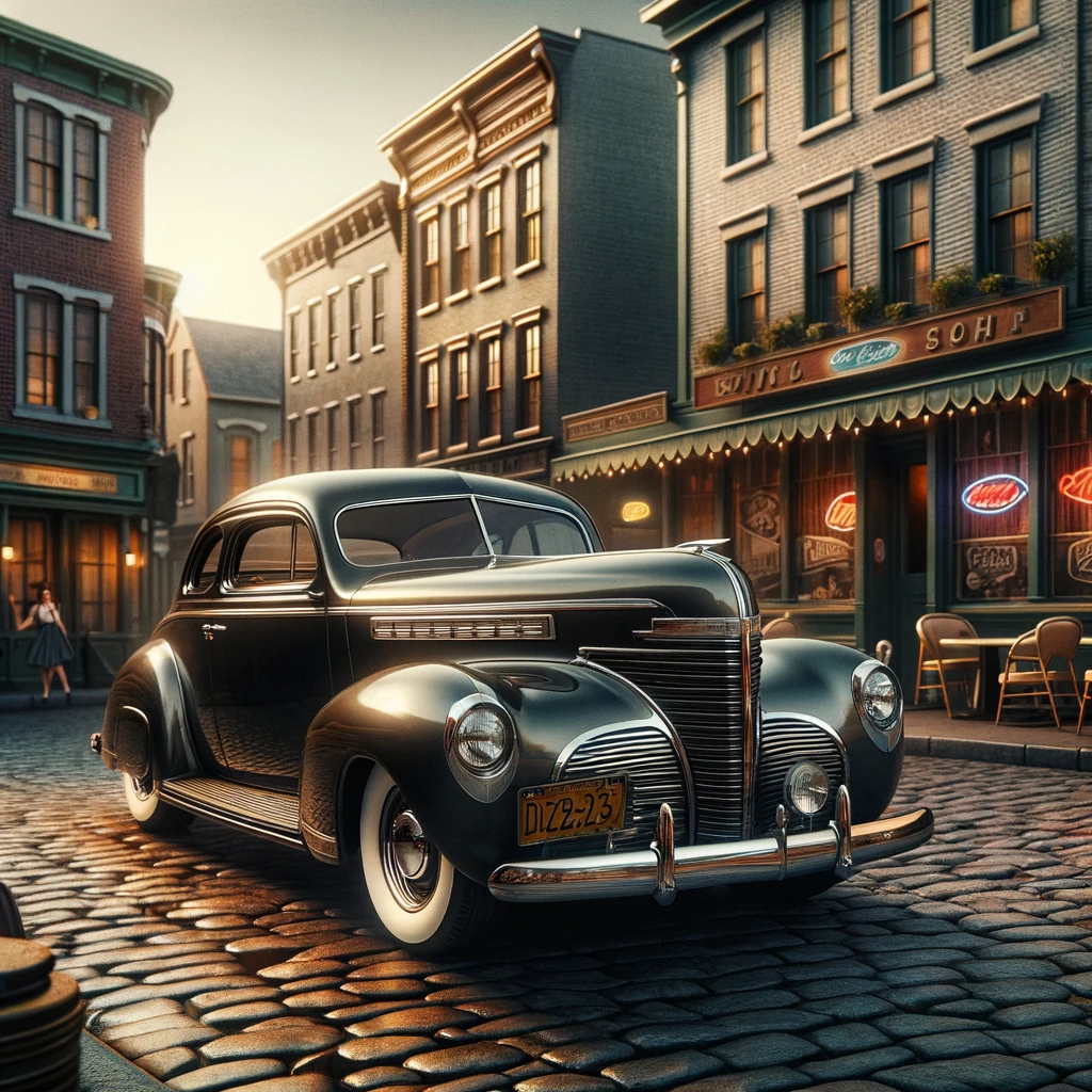 In the bustling streets of 1940s New York City, a sleek and stylish 1940 Cadillac Series 62 Coupe gracefully rests on cobblestones, its glossy black body shimmering under the city lights. Chrome details accentuate its elegant curves, exuding luxury and sophistication, as pedestrians pass by, casting admiring glances at this automotive masterpiece.