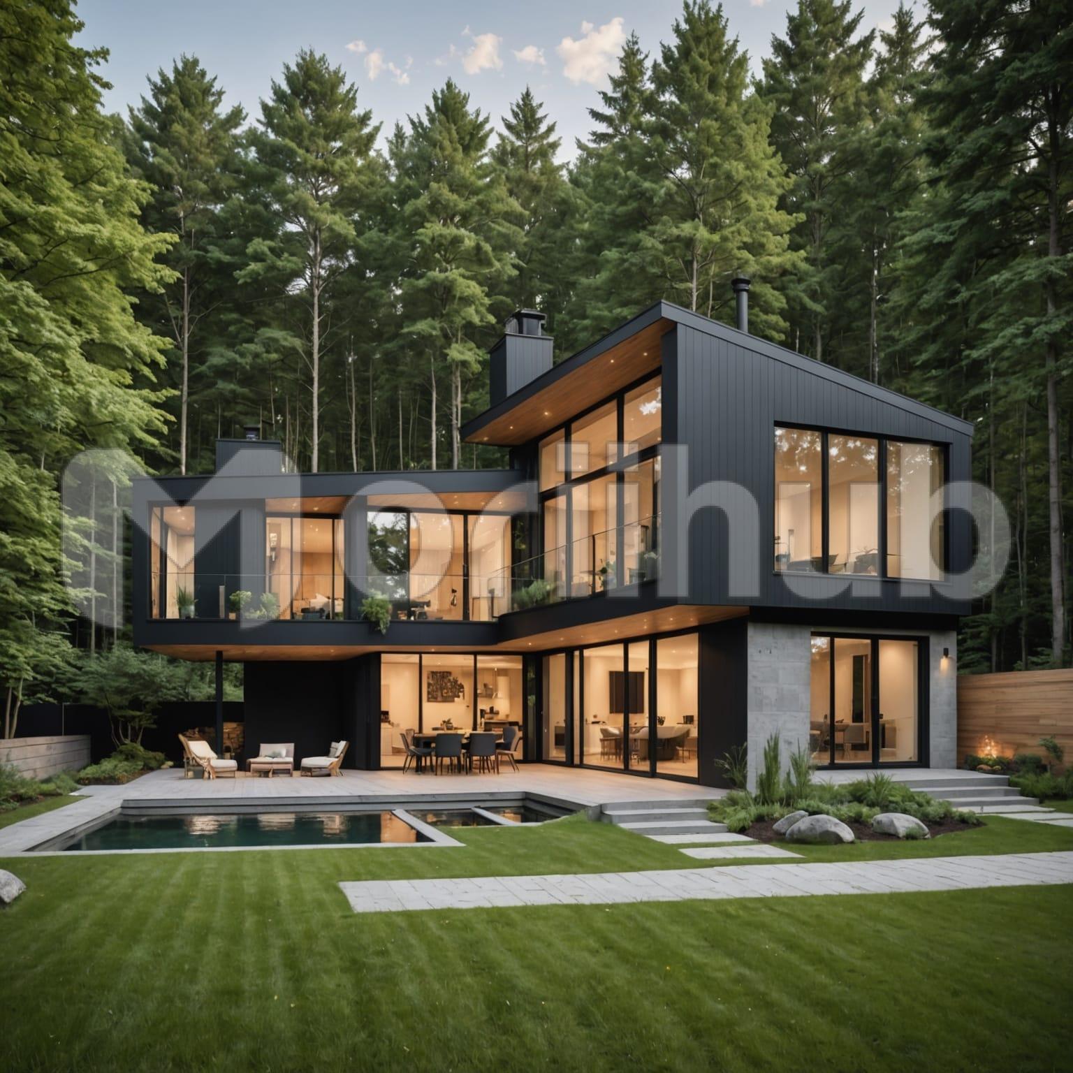 A modern bungalow, featuring sleek architecture and large windows, seamlessly blends with nature. The minimalist design highlights natural materials like wood and stone, while lush greenery surrounds the home. It’s a perfect balance of contemporary living and earthy tranquility, creating a peaceful retreat in harmony with nature.