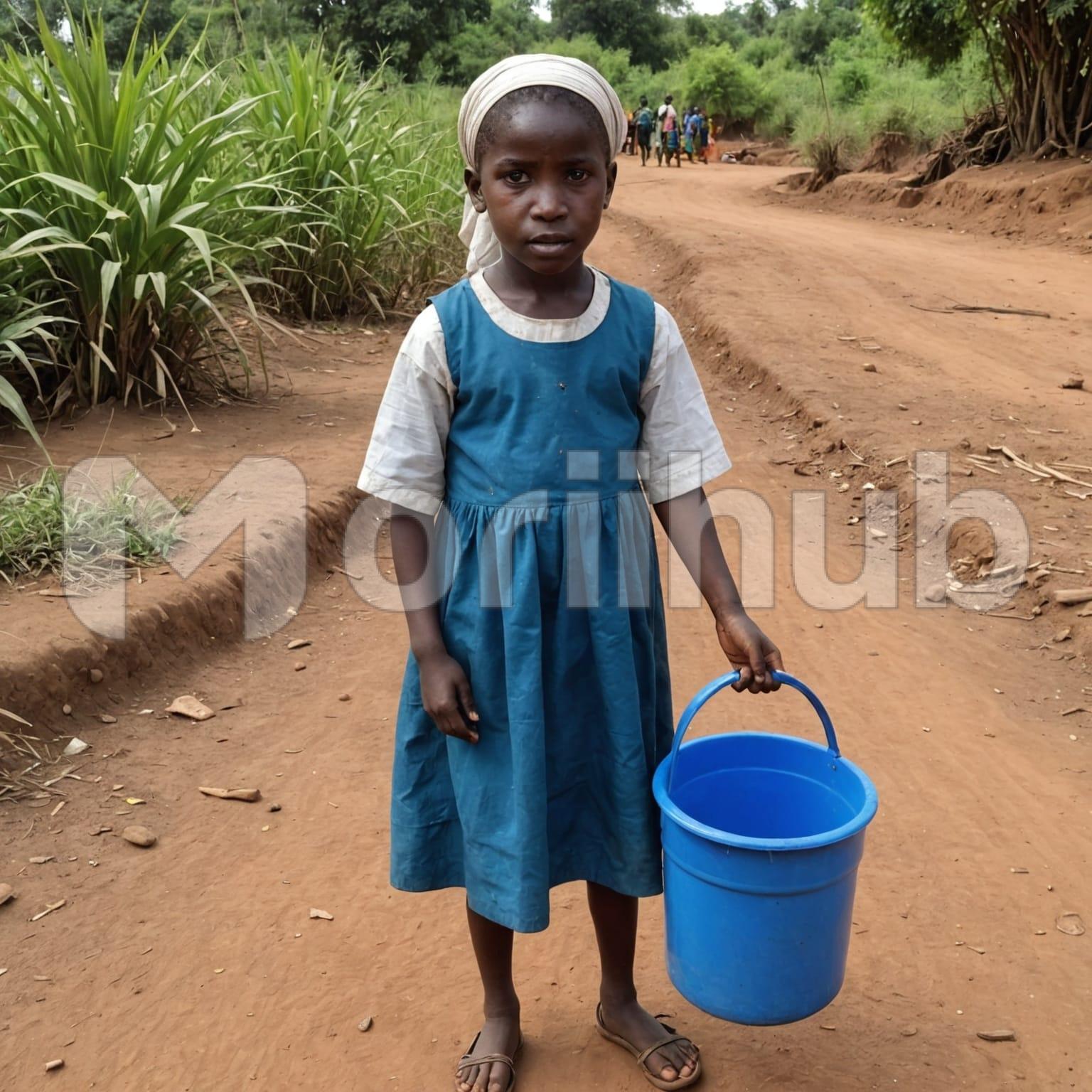 A young child rushes toward the stream, eager for a drink. Barefoot and determined, they navigate the rocky path, their small hands cupping the cool water. The surrounding trees sway gently in the breeze, while the sound of trickling water fills the air. The child’s face lights up with relief and joy.