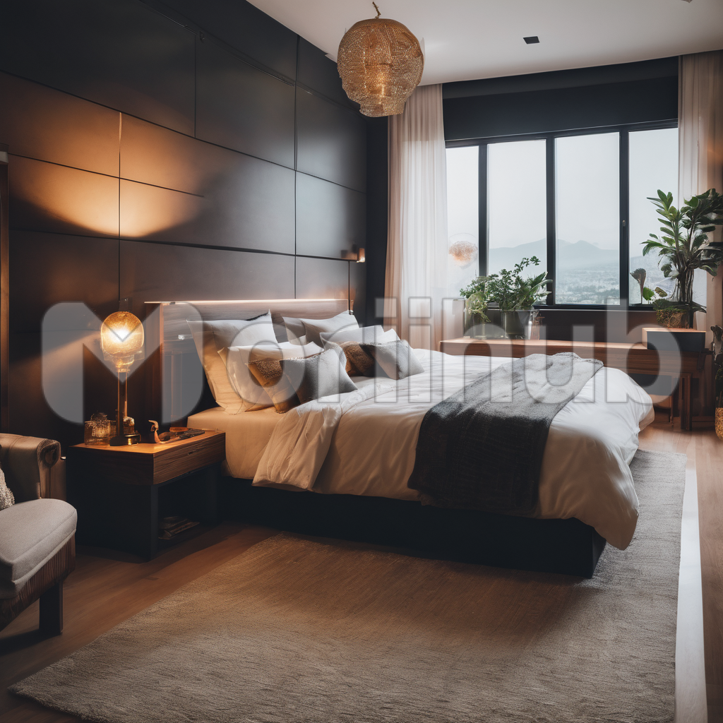 A well-arranged bedroom welcomes serenity. The bed, a haven of comfort, boasts meticulous bedding, a tranquil centerpiece. Flower pots, nestled in a cozy corner, add a burst of color and life to the room. Through the window, the cloudy sky lends a touch of introspection to the peaceful ambiance, a canvas of dreams awaiting to be explored, where comfort meets nature’s ever-changing tapestry.