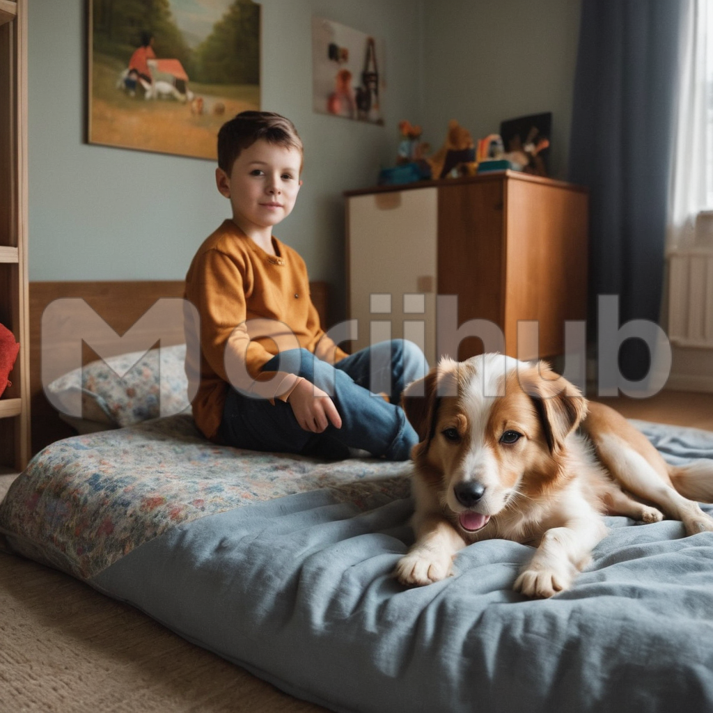 In a cozy bedroom scene, a boy and his loyal dog strike a heartwarming pose atop the bed, bathed in soft, natural light. Their bond radiates joy and companionship as they share a candid moment for the camera, creating a timeless snapshot of childhood and canine friendship, filled with warmth and affection.