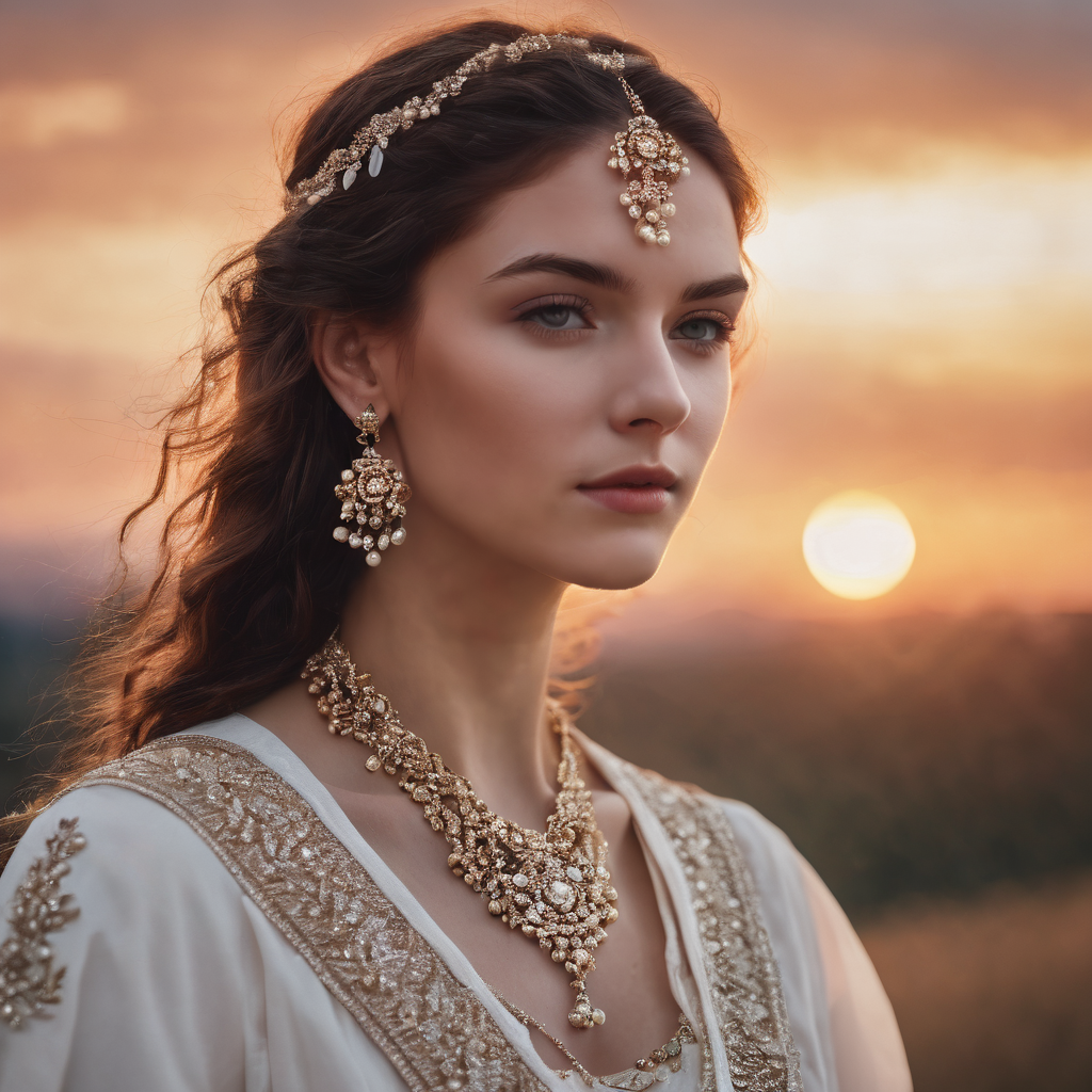 In the warm embrace of a sunset, a beautiful woman captivates, gazing forward with serene confidence. Her adorned neck pieces and earrings gleam, framing her face with exquisite grace. Jewels intricately woven into her hair catch the fading sunlight, casting a radiant glow. Against the backdrop of the setting sun, she stands as a portrait of timeless elegance, the sky painting a canvas for her beauty, a silhouette poised in the magical hues of dusk.