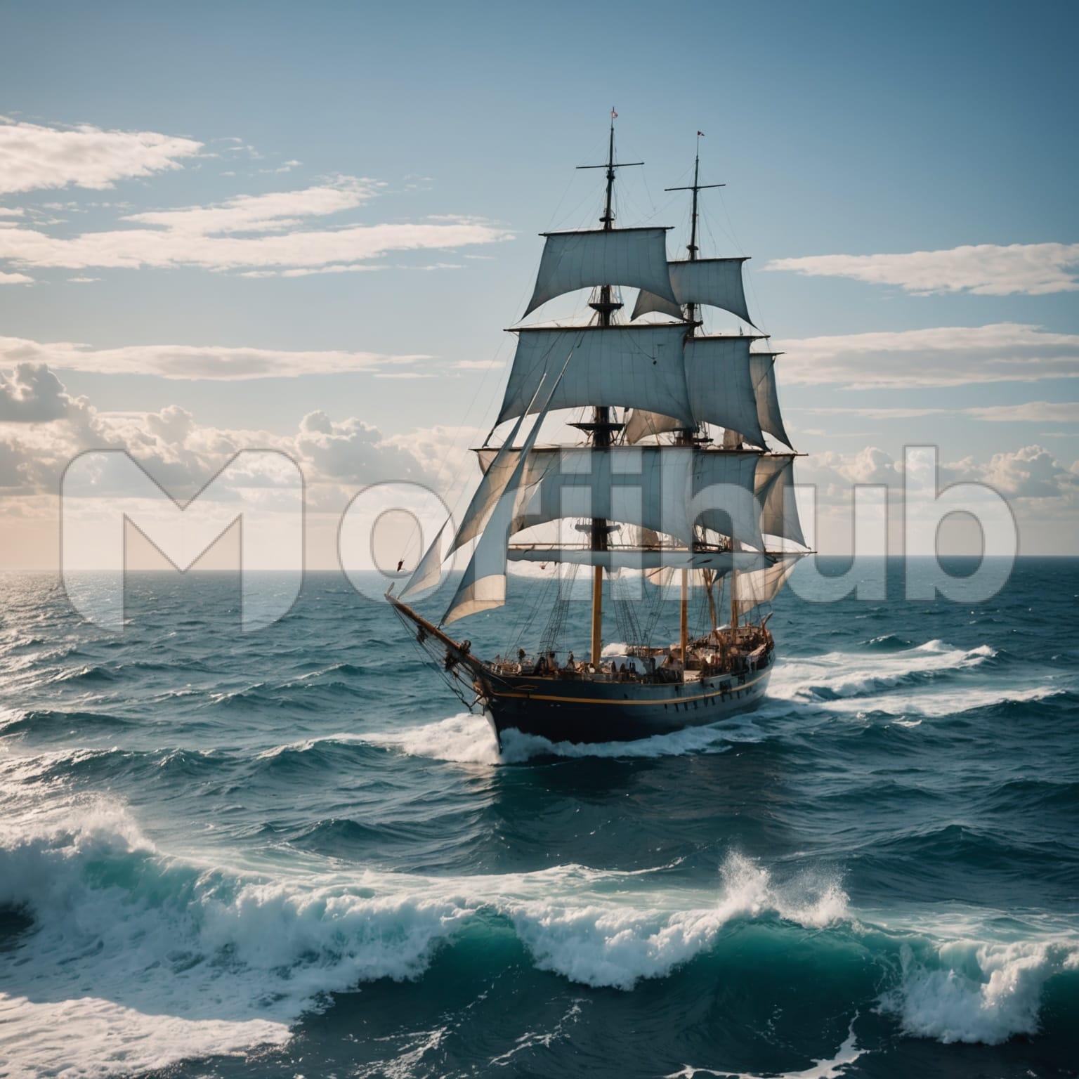 A majestic ship sails across the open sea, its tall masts catching the gentle breeze as it glides effortlessly over the shimmering waters. The vessel’s white sails billow gracefully, contrasting with the deep blue of the ocean. Above, wisps of clouds drift lazily across the clear sky, framing the ship’s journey in a tranquil embrace. The horizon stretches endlessly, a seamless meeting of sea and sky, evoking a timeless voyage of exploration and quiet wonder. Every detail of the scene radiates serenity, sparking dreams of endless adventure and exploration.