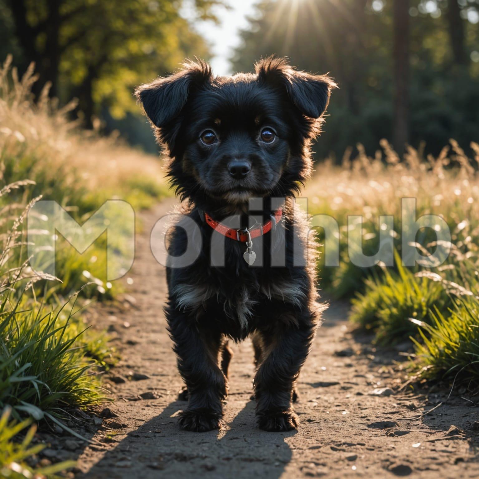 A cute black pup strolls down a narrow path, grasses swaying gently on either side. Its fur is soft and shiny, catching the light with every step. The pup’s ears droop adorably, bouncing slightly with its playful gait. Its eyes are bright and curious, taking in the world with boundless energy. As it sniffs the ground and occasionally looks up, there’s an innocence in its every move. The grassy surroundings add a touch of wild beauty, framing the little adventurer perfectly as it explores its enchanting world.