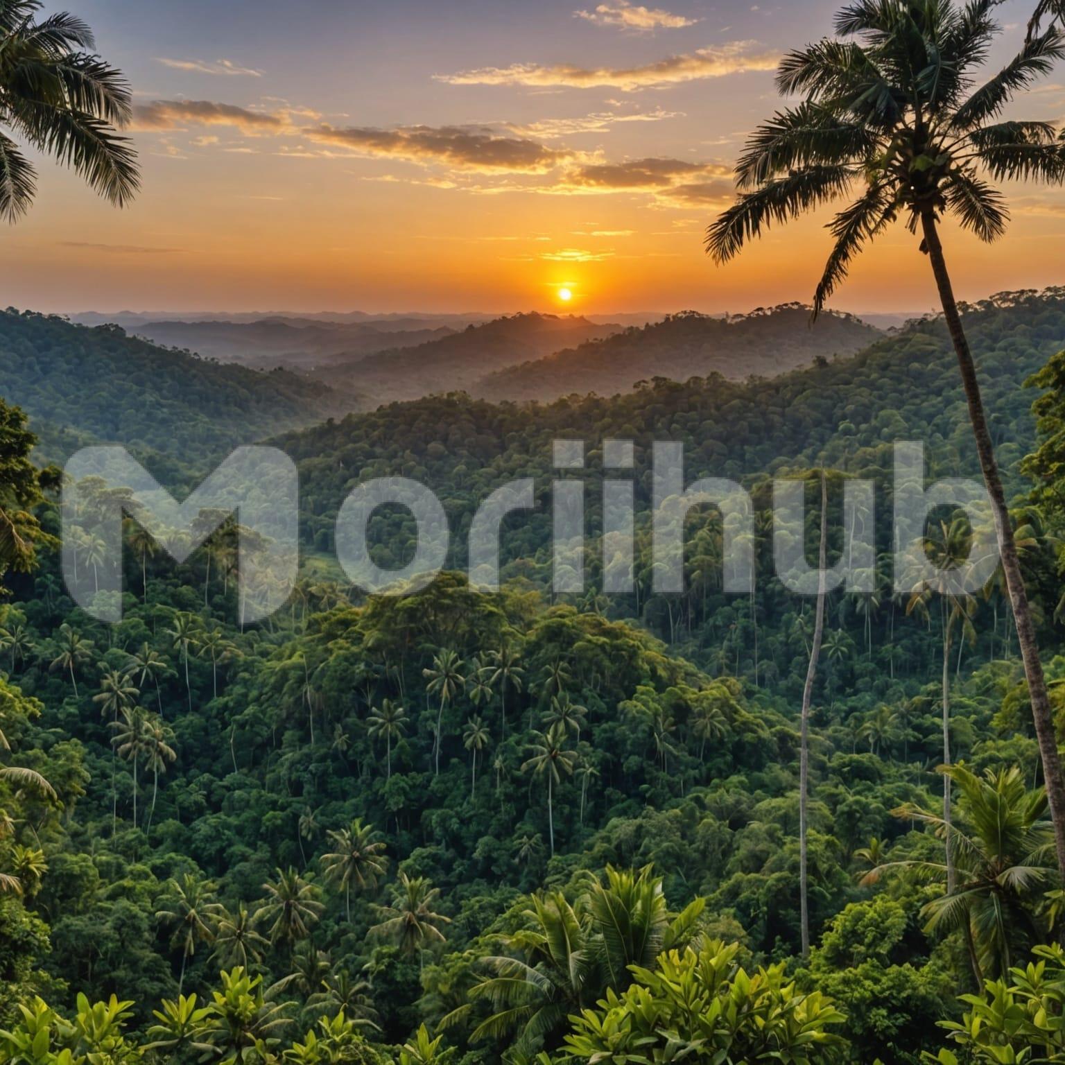 An aerial view shows a wide stretch of jungle, with dense treetops forming a continuous layer below. In the distance, the sunset rests low on the horizon, its shape soft and steady without harsh lines. Scattered clouds drift lightly across the sky, adding quiet detail without covering the view. The scene remains calm, shaped by the even spread of the jungle and the soft presence of the sky above. The contrast between the quiet jungle below and the smooth light of the distant sunset creates a simple, steady, and uncluttered appearance.
