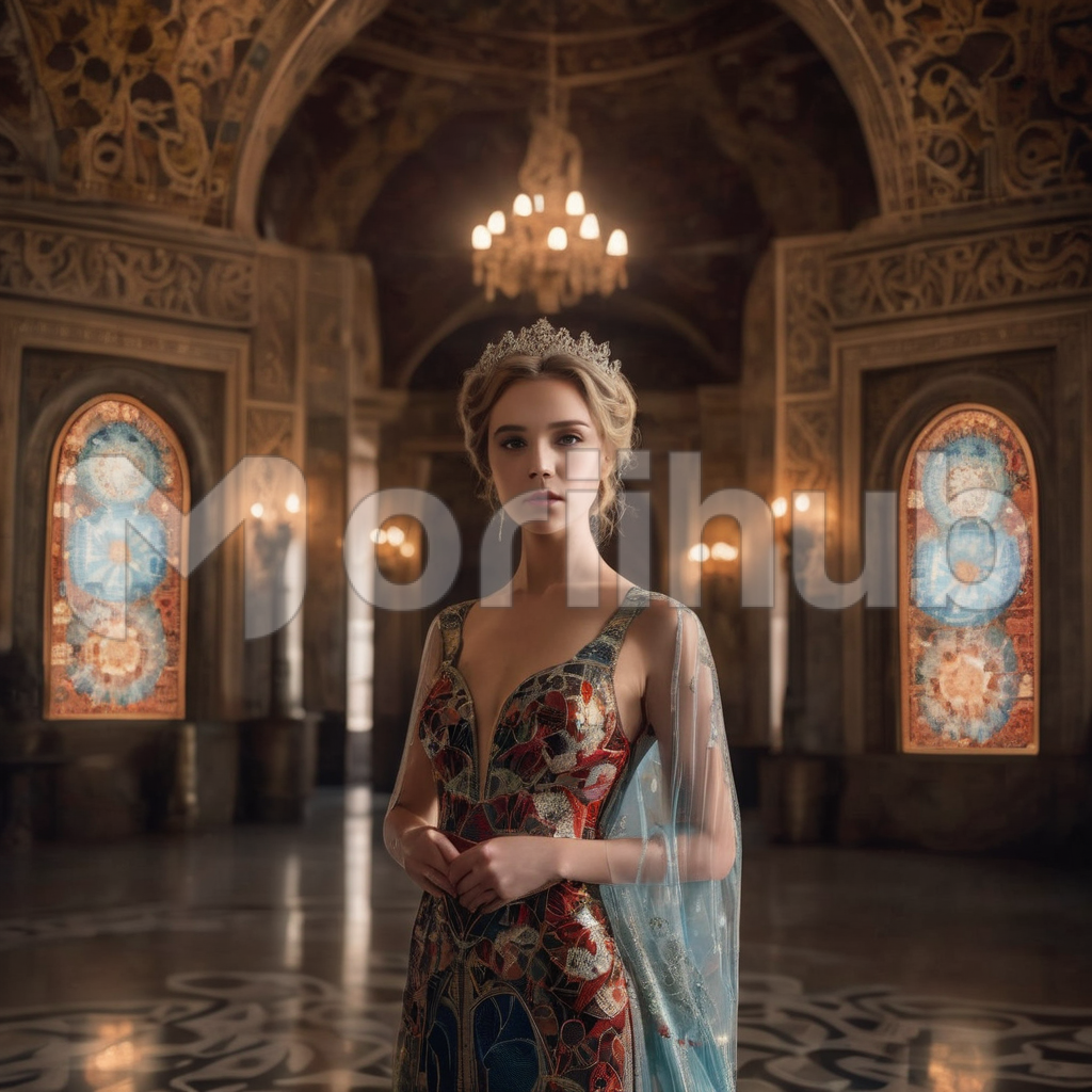 In the grandeur of an elegant hall, a beautiful woman stands with poised grace, her hands delicately clasped together. Adorned in timeless sophistication, she becomes a living masterpiece amidst the opulent surroundings. The ambient light reflects off polished surfaces, enhancing the regality of the moment. Her poised demeanor and the refined surroundings intertwine, creating a scene where beauty and elegance converge in a captivating display of grace and sophistication.