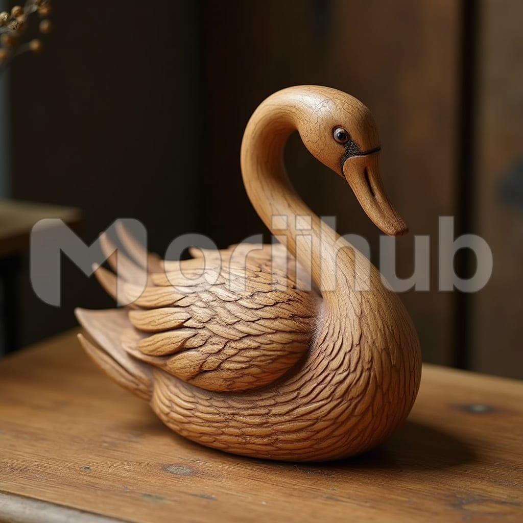 A wooden sculpture of a swan rests on the table, its form shaped with smooth, flowing lines. The gentle curve of its neck and the subtle detailing along its body capture the bird’s grace. The wood’s natural grain runs through the polished surface, adding depth to its appearance. Light falls softly across its contours, highlighting the careful craftsmanship. The simplicity of its design enhances its elegance, making it a quiet yet striking presence. A timeless piece, it embodies both artistry and the beauty of nature in its carved form.