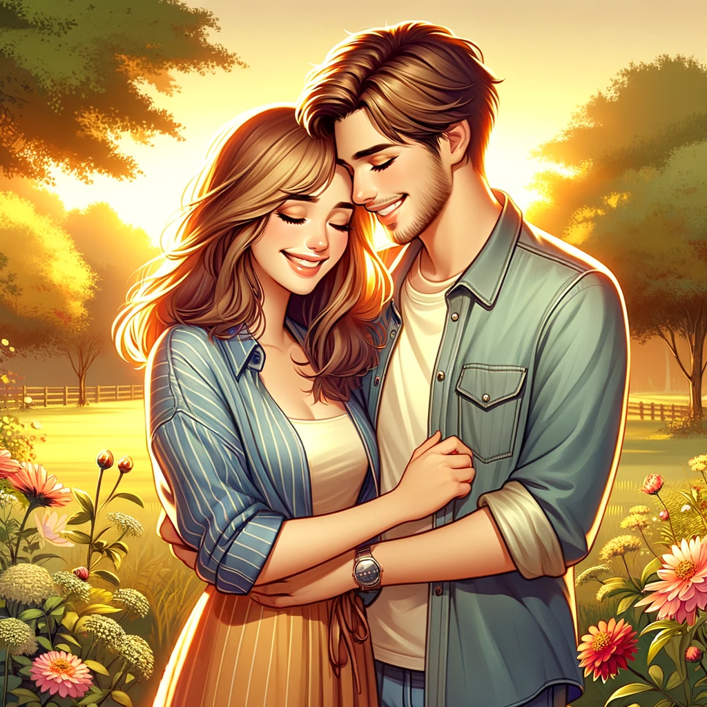 In the heartwarming illustration, a happy couple stands close together, enveloped in a moment of pure joy and affection. Their arms are wrapped around each other, their smiles radiant with love. Their eyes meet with tenderness, and the warmth of their embrace speaks volumes of the deep connection they share, portraying a beautiful image of love and unity.