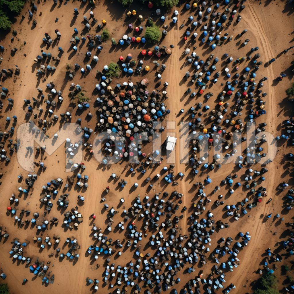 From a drone’s eye view, the African community unfolds like a vibrant tapestry below. Houses cluster in kaleidoscopic patterns, adorned with colorful rooftops that echo the spirit of the land. People move with purpose through dusty streets, their laughter and chatter blending with the rhythmic beats of daily life. Market stalls burst with a cornucopia of goods, while children play with boundless energy in the open spaces between homes. Amidst the red-earthed landscape, this community thrives, a testament to resilience and unity in the heart of Africa.