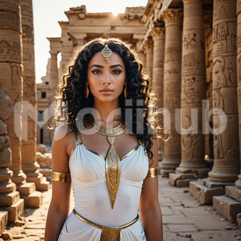 Amidst ancient grandeur, a woman stands in quiet contemplation, her gaze fixed ahead with serene determination. Behind her, towering temple pillars rise, weathered yet resolute against the passage of time. The woman’s presence exudes a sense of reverence, as if she is connected to the storied history surrounding her. In this timeless tableau, the convergence of past and present creates a moment of introspection, inviting reflection upon the mysteries of the ages.