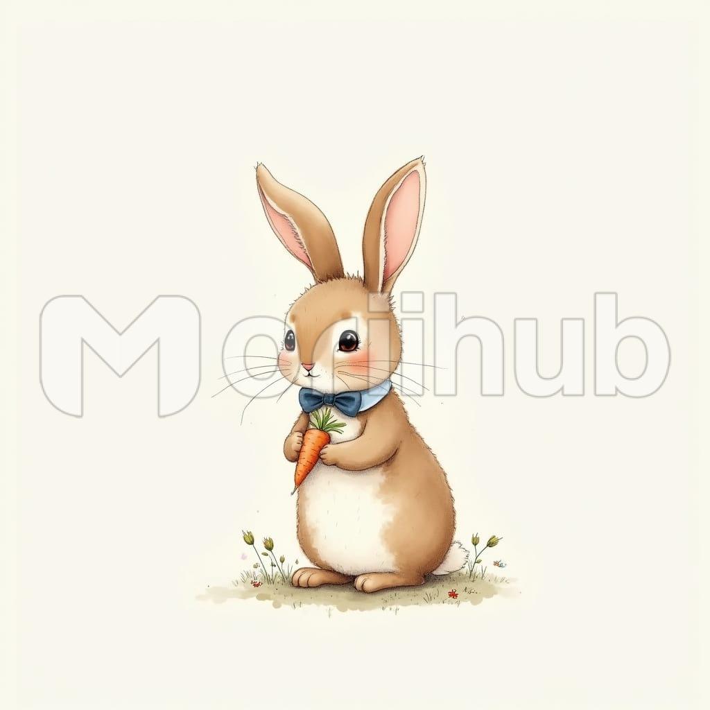 A cartoon bunny is shown standing upright, holding a small carrot close to its body. Its round face features wide eyes and a small nose, giving it a cheerful, gentle look. A neat bowtie is drawn around its neck, adding a playful touch to its appearance. The ears stand tall, slightly curved, and its small feet are placed together. The carrot rests in its grasp, drawn with simple lines and a leafy top. The background remains plain, keeping attention on the bunny and its light, whimsical presence.