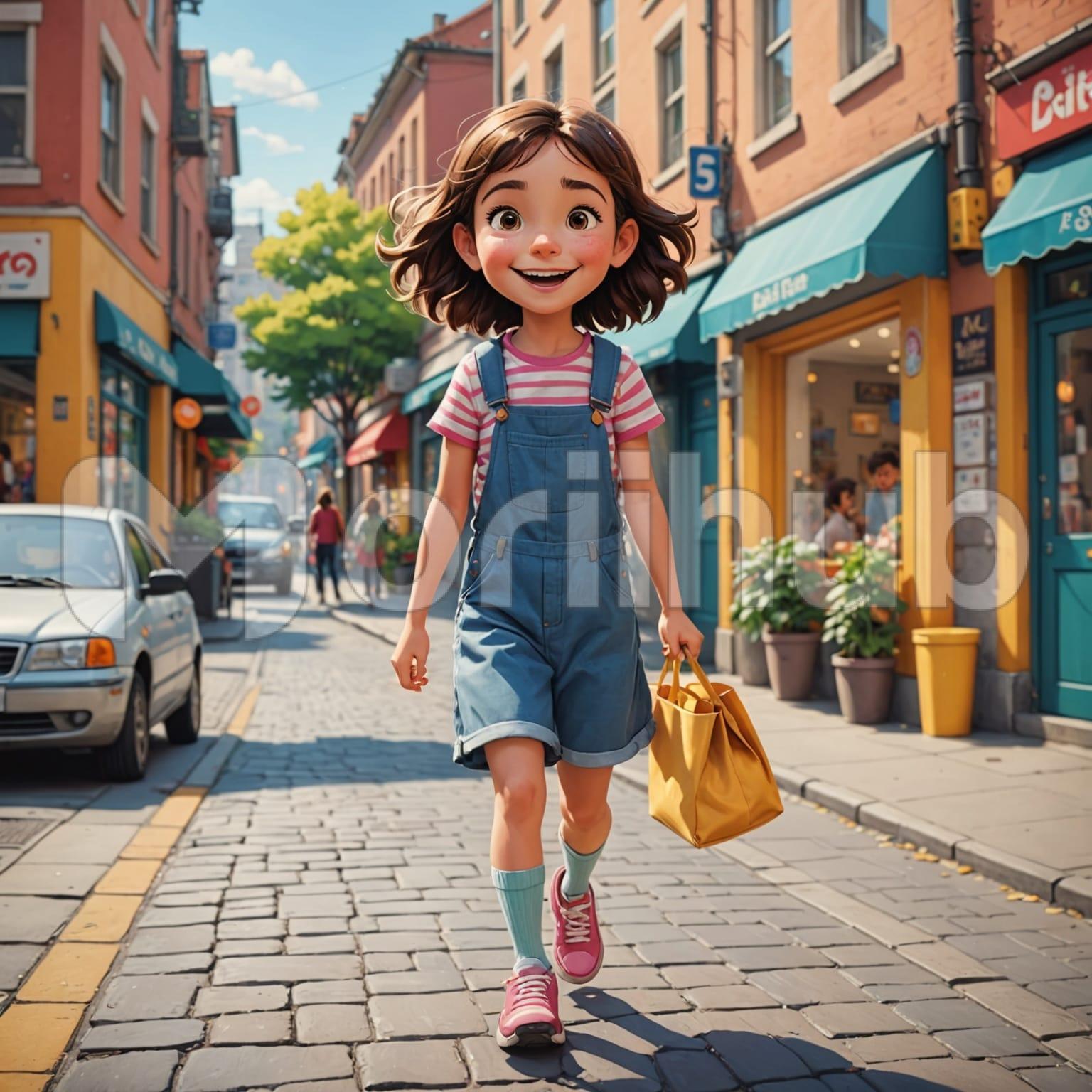 A cartoon girl walks down a quiet street, her cheerful smile setting a bright, positive tone. She carries a bag in one hand, its gentle swing matching the light rhythm of her steps. Her posture is relaxed, giving her a friendly, approachable look. Buildings line the background, adding context without overpowering the scene. A sense of calm activity fills the surroundings, keeping the focus on her joyful expression. The illustration captures a simple, warm moment, highlighting her pleasant stride and the easy charm of an everyday walk.