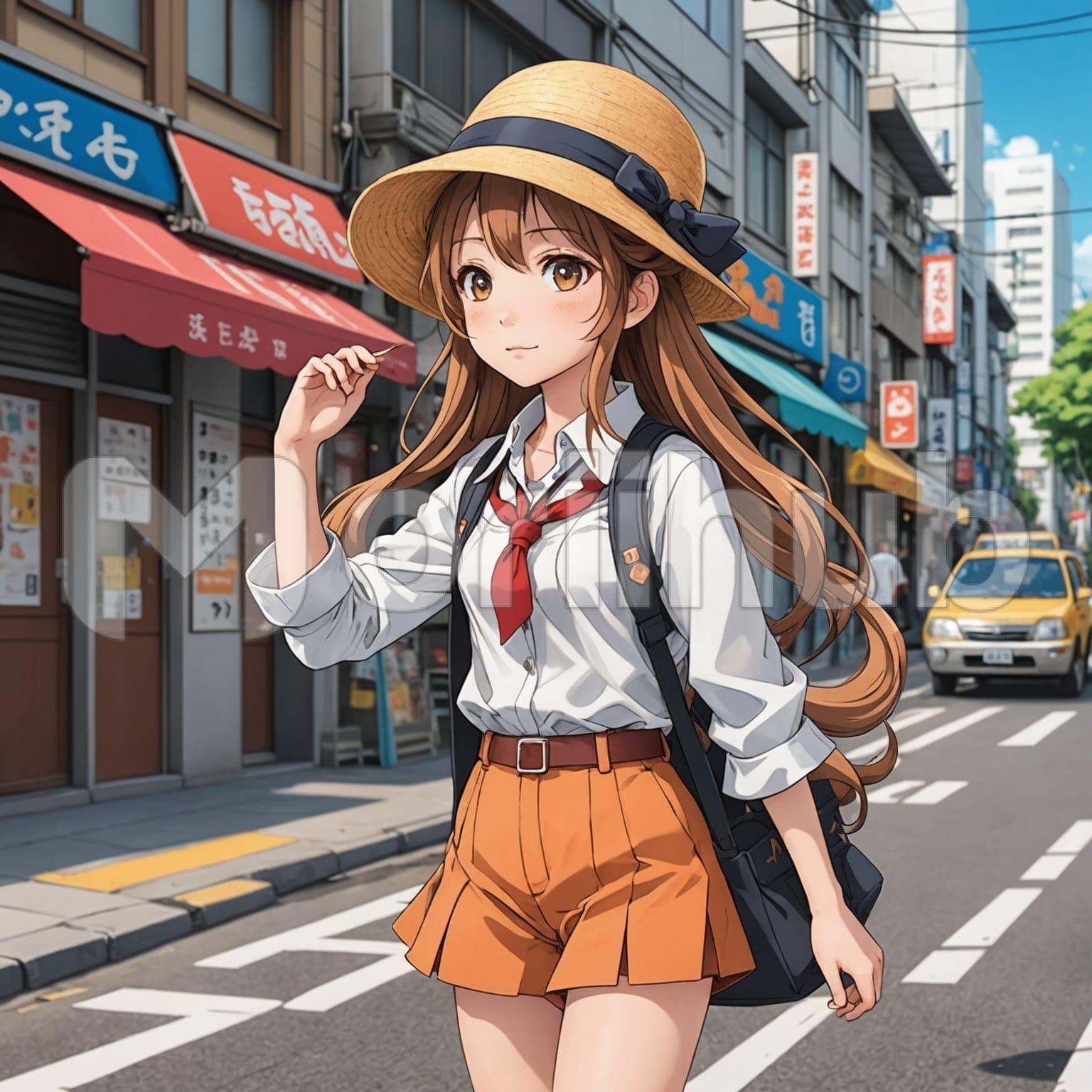 In an animated world, a spirited girl walks down a bustling street, her hat adding a touch of whimsy to her lively stride. Behind her, people move with little motions, each distinguished by colorful outfits and animated expressions. The girl’s face radiates curiosity and determination, framed by her hat’s brim and wisps of flowing hair. Sunlight filters through fluffy clouds, casting shadows on the pavement. With each step, the girl brings her own energy to the bustling animated scene unfolding behind her.