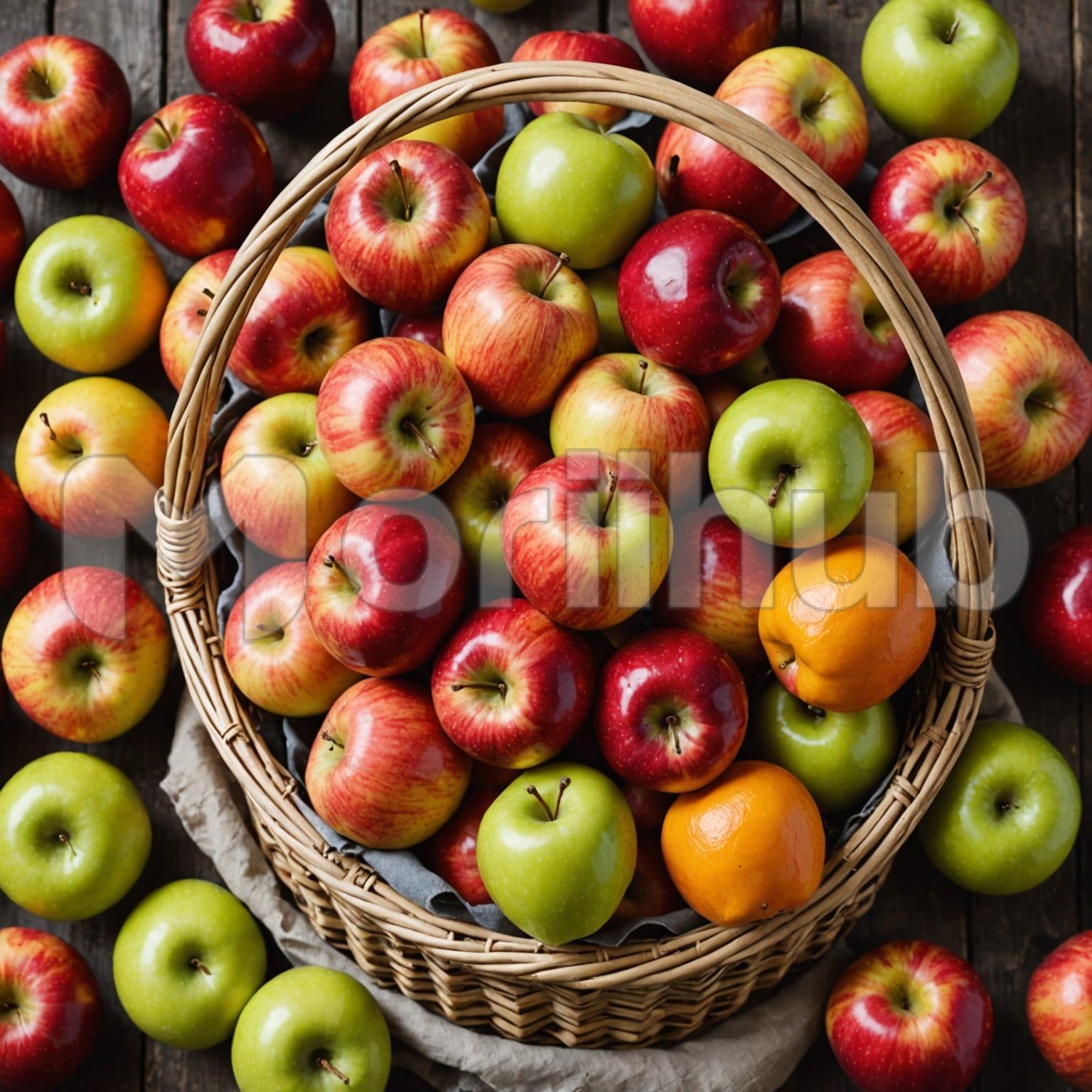 A basket rests gently on the surface, filled with ripe apples, their smooth, slightly dimpled skins inviting a closer look. A few apples have rolled out, scattered beside the basket, their natural shape and texture standing out against the woven fibers. The apples, resting in the basket and nearby, seem fresh and ready to be enjoyed. The rustic charm of the scene is simple yet inviting, with the apples’ glossy surfaces catching the light, offering a quiet reminder of nature’s abundance.
