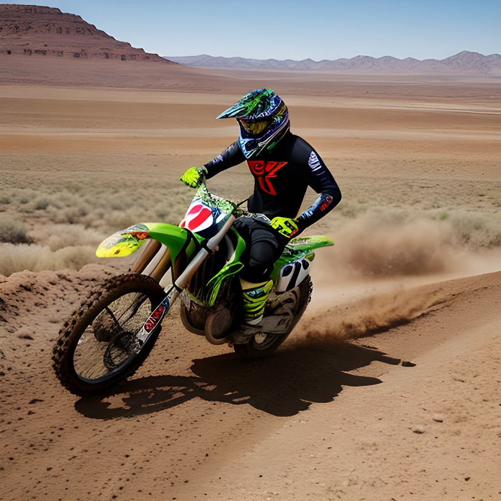 In the vast expanse of an arid landscape, a young man epitomizes the spirit of adventure astride a dirt bike. Dressed in a complete riding suit with a helmet securing his determination, he becomes a striking figure against the barren terrain. The roar of the engine blends with the solitude of the arid location as he navigates the rugged path with skill. Mountains loom majestically in the distance, their peaks touching the clear, expansive sky. The air is thick with a sense of freedom, as tire tracks etch a temporary story into the dry earth. In this exhilarating moment, the harmony of man, machine, and nature converges under the vast, unyielding gaze of the distant mountains.