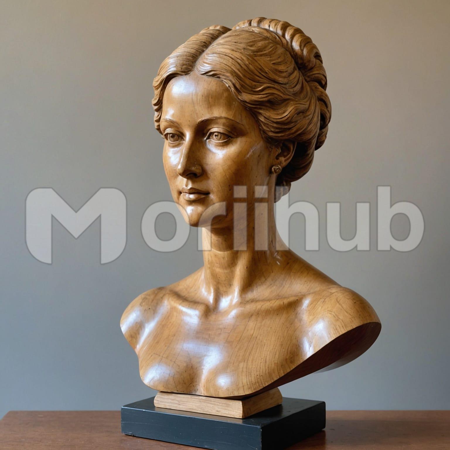 A wooden bust of a woman stands elevated on its base, shaped with care to reflect elegance and balance. The face is formed with smooth precision, features refined yet understated, carrying a quiet expression. The lines of the neck and shoulders flow naturally, carved to suggest grace without excess. The wood itself shows texture that adds depth, grounding the piece in its natural medium. Resting on its stand, the bust holds presence, a crafted portrayal that feels both timeless and composed in its simplicity.