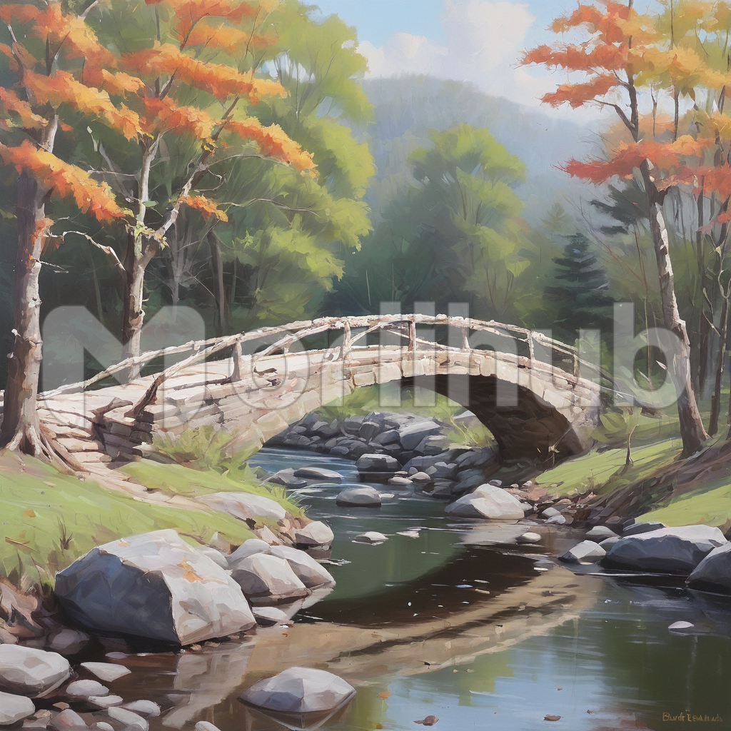 In the quiet serenity of the countryside, a painting captures the timeless beauty of a bridge. Stretching gracefully across a tranquil river, it becomes a symbol of connection and passage. The artist’s brushstrokes imbue the scene with a sense of nostalgia, each stroke evoking the peaceful ambiance of the landscape. The bridge’s arches reflect in the shimmering waters below, creating a mesmerizing interplay of light and shadow. Surrounding the bridge, verdant foliage adds to the scene’s tranquility, while distant hills fade into the horizon, lending a sense of depth and perspective to the painting. With every glance, the viewer is transported to a serene oasis, where the bridge becomes not just a structure, but a gateway to moments of reflection and contemplation.