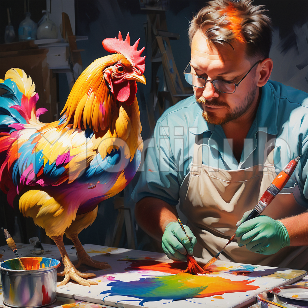The painter stood before his easel, completely absorbed in his work on a captivating chicken painting. His palette, brimming with earthy hues and vibrant reds, mirrored the intricate plumage of the rooster he was depicting. Each brushstroke was deliberate, capturing the texture of feathers and the proud stance of the bird. The background, a subtle blend of barnyard elements, added depth and context to the portrait.