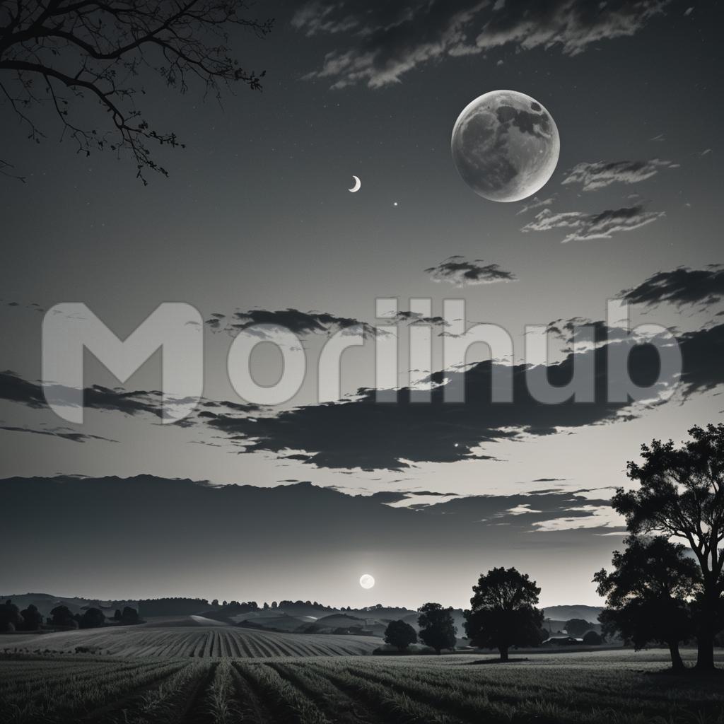 The scene is bathed in a serene, silvery glow, with the moon hanging low in the sky, casting long shadows across the landscape. Silhouettes of tall, weathered barns, rows of crops, and a lone windmill stand out starkly against the night sky. The trees, with their delicate branches, create intricate patterns that add depth to the scene. The quiet beauty of the moonlit farmland evokes a sense of peace and timelessness, capturing the essence of rural life in a simple yet powerful way.