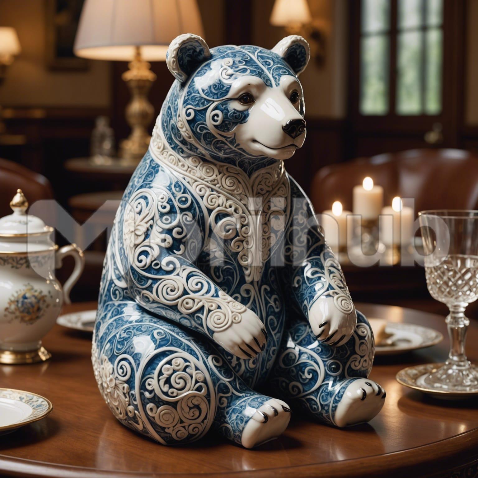 Perched atop a table, an ornamental porcelain bear captivates with its serene presence. Crafted with meticulous detail, its fur appears lifelike, each strand delicately etched into the ceramic surface. With eyes that seem to gleam with quiet wisdom, it sits in tranquil repose, its form exuding a sense of timeless elegance. Against the smooth tabletop, it commands attention, a symbol of grace and beauty frozen in porcelain. In its silent vigil, the bear embodies a quiet strength, inviting admiration and contemplation from all who behold it.