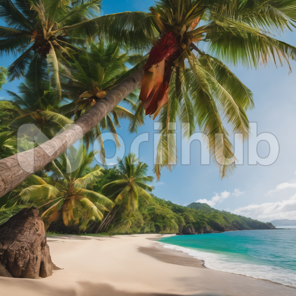 A tropical beach unfolds like a dream, where ivory sands meet azure waves in an eternal dance. Palm trees sway in the balmy breeze, casting elongated shadows on the shore. The air is redolent with the fragrance of salt and coconuts. Gentle waves serenade the coastline, inviting wanderers into the embrace of paradise.