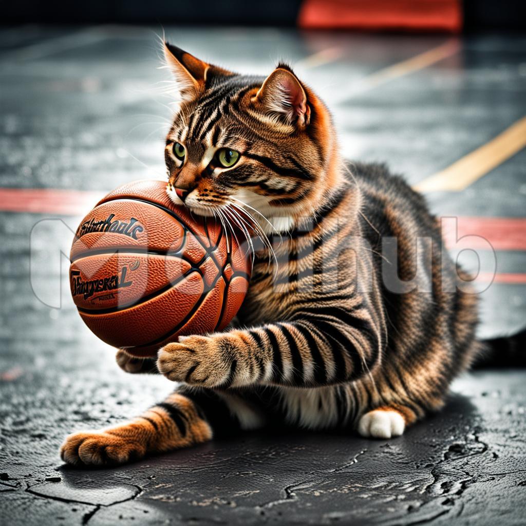 This playful cat bounces around with a basketball, swatting it with its paws. Its energy and curiosity turn the simple game into pure joy.