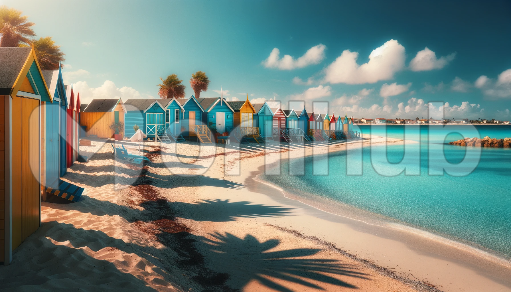 This picturesque beach vista captures serenity and vibrance in equal measure. Along the tranquil shore, a row of charming beach huts stands proudly adorned in vivid colors: brilliant blues, sunny yellows, and fiery reds. Against the backdrop of the serene seascape, these colorful huts evoke a sense of whimsy and joy, inviting beachgoers to bask in their beauty while enjoying the peaceful coastal ambiance.