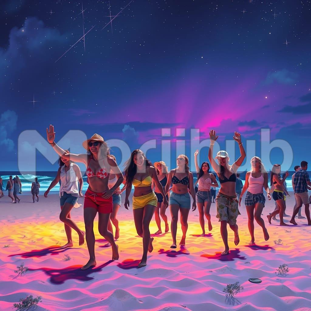 Under the starry sky, the beach buzzes with laughter and music. Friends dance by the waves, children chase glowing lanterns, and couples stroll barefoot in the cool sand, soaking in the magic of the night.