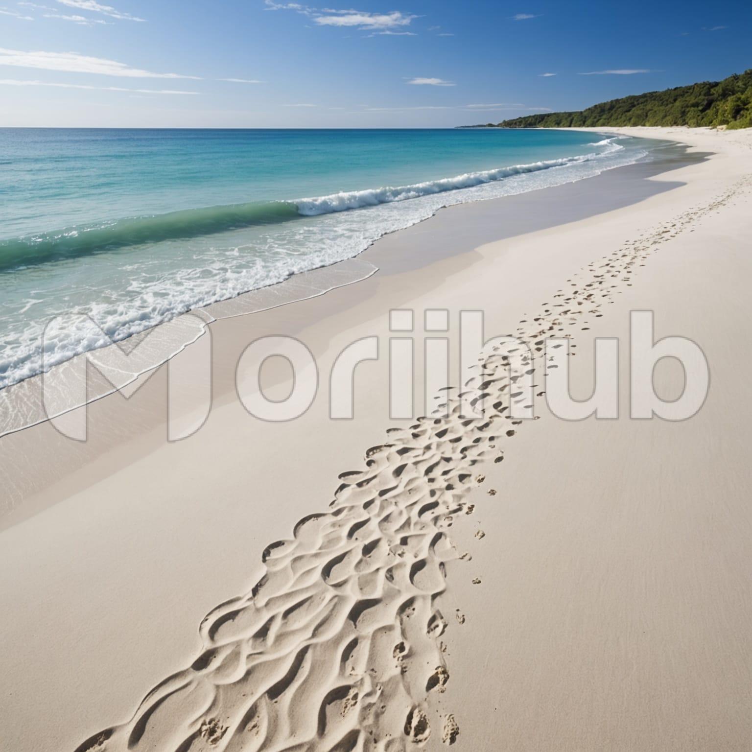 A white sand beach stretches toward the horizon, meeting the gentle waves rolling onto the shore. The sand appears smooth, untouched, and soft underfoot. The ocean extends in a vast expanse, its surface shifting with the rhythm of the tide. Wisps of clouds drift across the sky, their reflections faintly visible on the wet sand. The air carries a light saltiness, blending with the sound of waves lapping at the shore. The scene is calm, open, and serene, inviting quiet contemplation by the water’s edge.