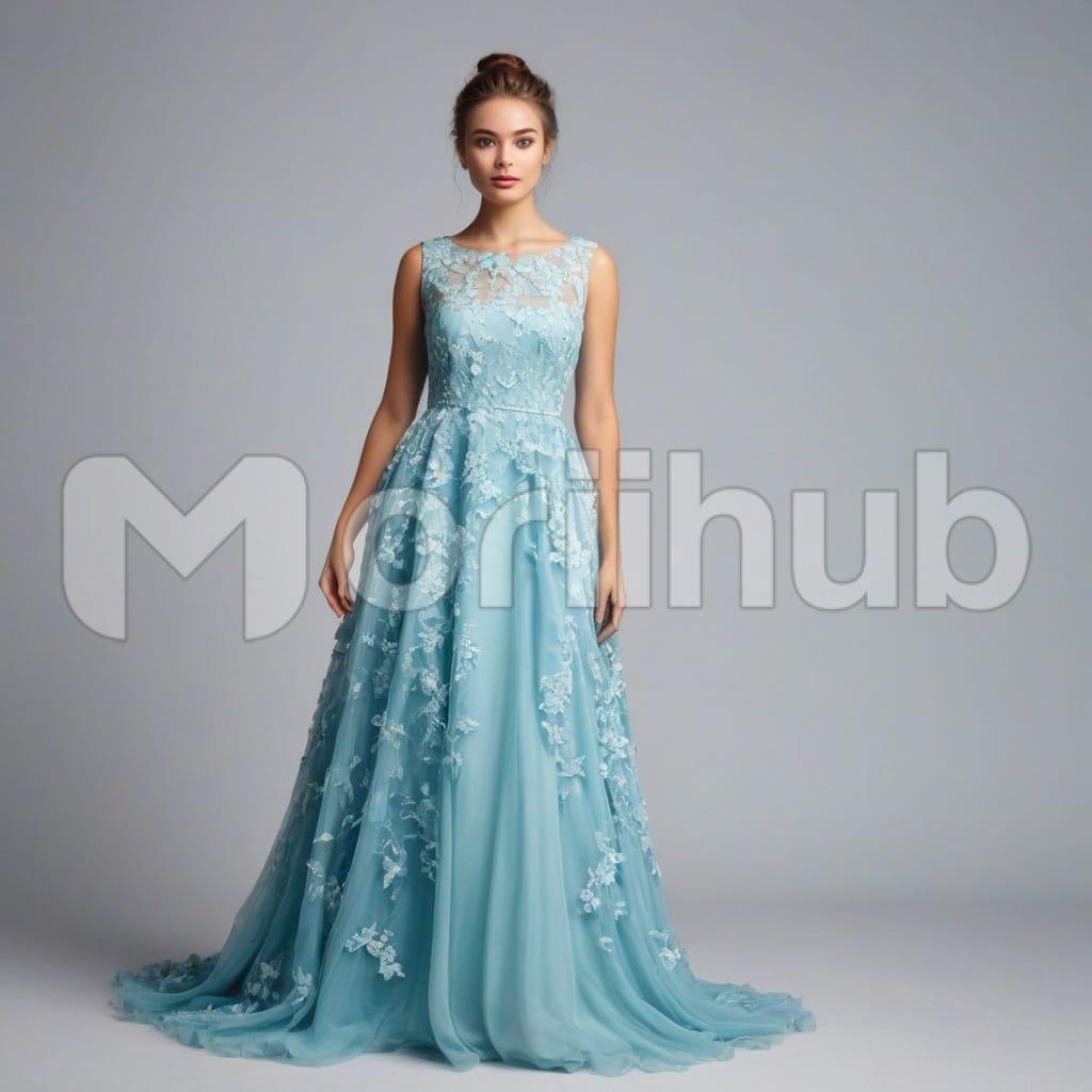 A sweet young woman twirls gracefully in a flowing gown, its soft fabric shimmering with every step, her smile as radiant as the dress’s delicate details.