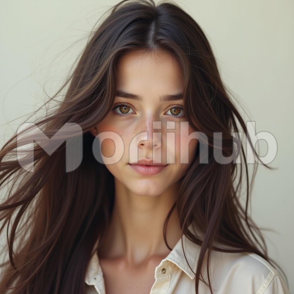 A beautiful woman stands confidently, her gaze fixed ahead with a sense of purpose and determination. Her features are striking, with high cheekbones and a serene expression that radiates warmth. Her hair cascades down her shoulders, framing her face in soft waves. Dressed in a simple yet elegant outfit, she exudes an effortless charm that captivates those around her. The plain background emphasizes her presence, allowing her natural beauty and poise to shine through. In this moment, she embodies strength and grace, inviting admiration and intrigue.