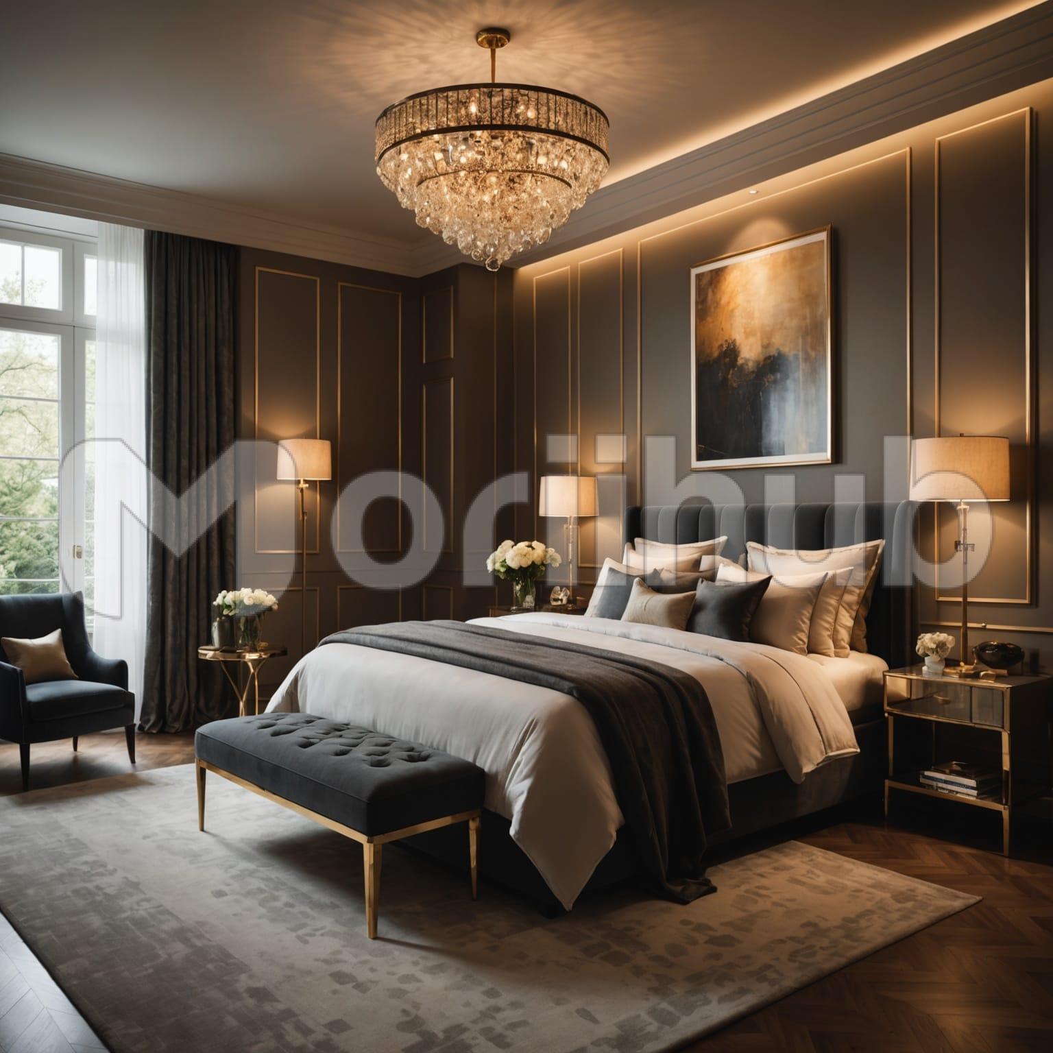 The bedroom exudes a serene elegance, with a cozy bed at its center. A stylish art frame hangs on the wall above the bed, adding a touch of sophistication. On either side, lamps cast a warm glow, their light reflecting off flower pots that add a fresh, natural element. A chandelier hangs gracefully from the ceiling, providing a focal point of subtle opulence. In the corner, a comfortable chair invites relaxation. The room blends classic and modern touches, creating a harmonious and inviting sanctuary.