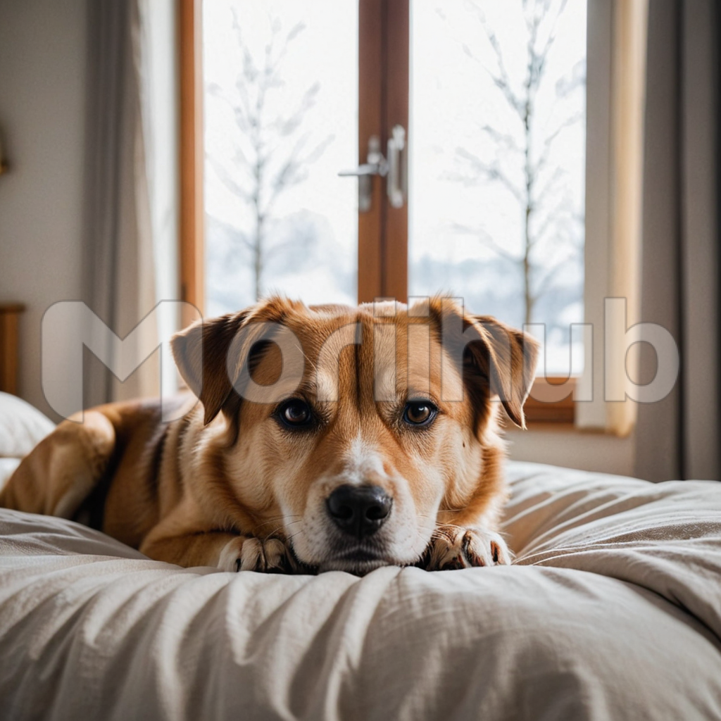 Upon the plush expanse of the bed, a canine companion reclines, his gaze fixed on a distant point beyond. With ears drooped and eyes alert, he surveys his surroundings with a mix of curiosity and vigilance. His fur, bathed in the soft glow of ambient light, exudes a sense of warmth and comfort. In this tranquil tableau, the dog’s presence lends a touch of companionship and reassurance, his watchful demeanor a reminder of the loyalty and steadfastness that dogs bring into our lives.