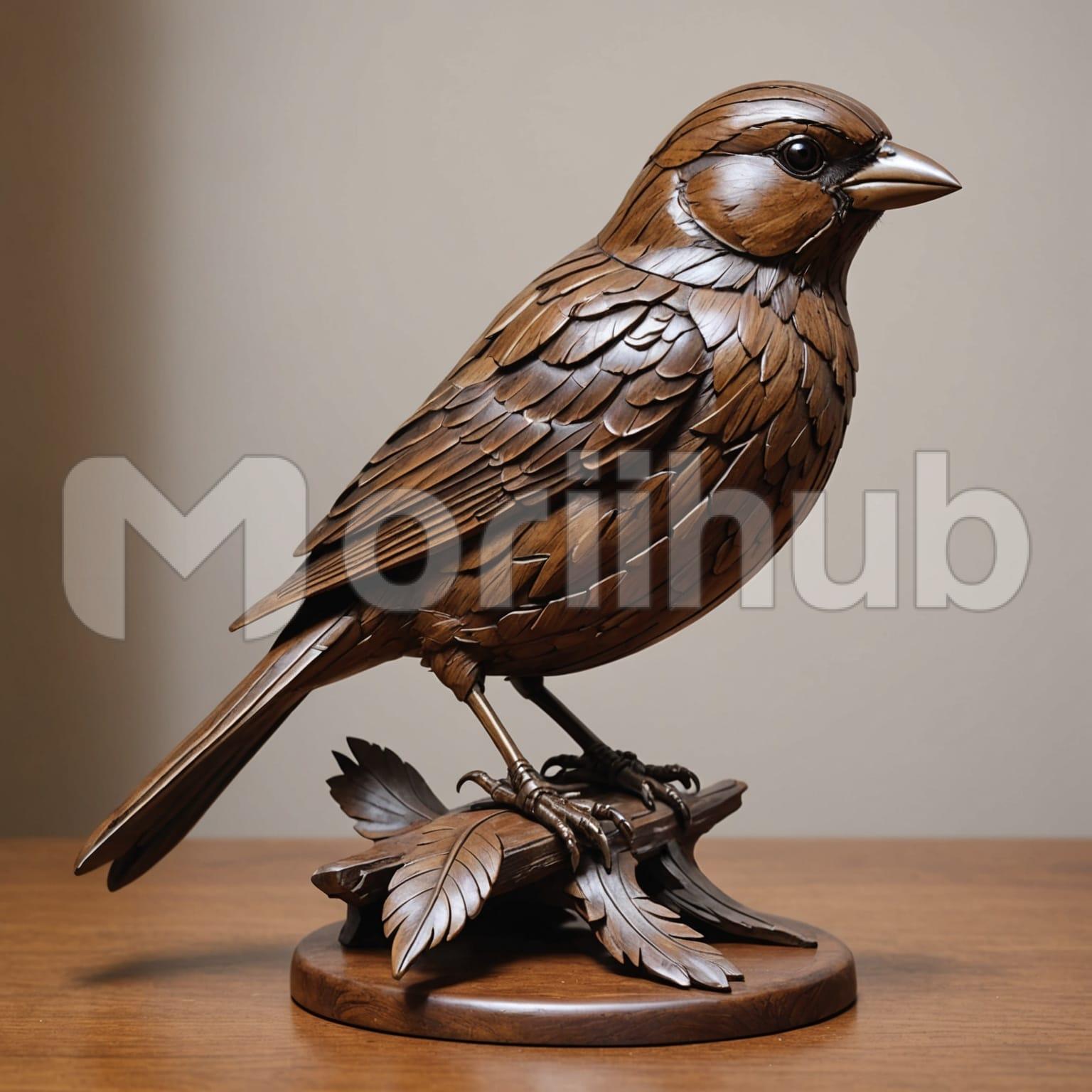 A wooden sculpture of a sparrow captures the bird in fine detail, each carved feature carefully shaped. The smooth contours of its form highlight the craftsmanship, with delicate lines suggesting the texture of feathers. The slight tilt of its head gives a sense of quiet observation, as if caught in a fleeting moment. The natural grain of the wood adds depth, complementing the careful carving. Subtle variations in tone enhance the lifelike quality, making the sparrow appear almost ready to move, a simple yet skillfully crafted tribute to nature.