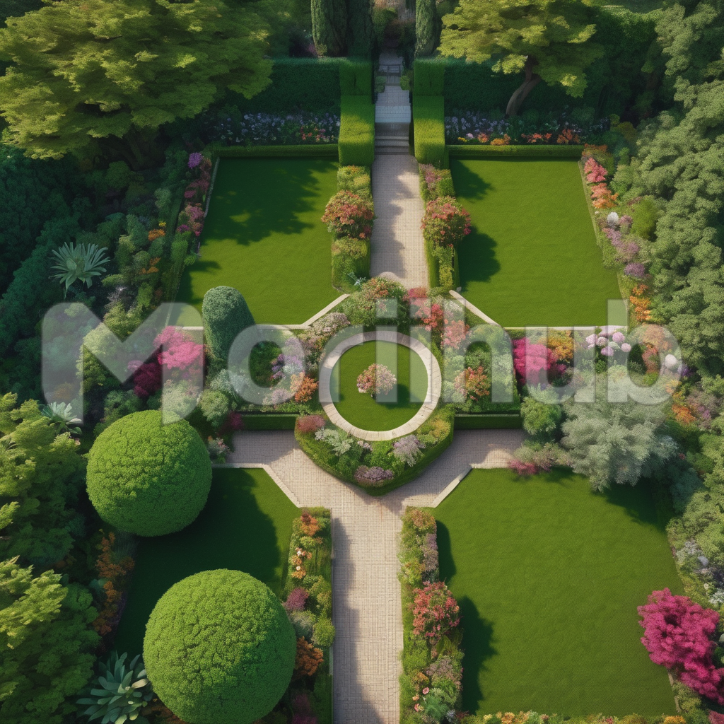 An aerial view of a garden unveils a breathtaking panorama of lush greenery and meticulously designed landscapes. The symphony of colors from vibrant flowers and neatly manicured lawns captivates the eye. Paths and hedges create intricate patterns, while trees stand tall, providing shade and structure. This bird’s-eye view offers a sense of serenity and wonder, as if witnessing nature’s artwork from above.