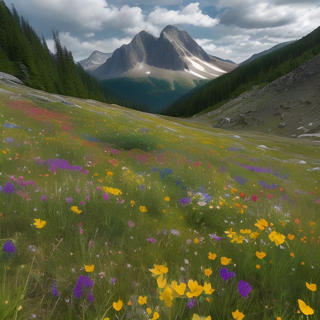 Under a sky adorned with soft billowy clouds, a sprawling field of wildflowers unfurls its vibrant tapestry. Each blossom, painted in nature’s palette, sways gracefully in the gentle breeze, embracing the beauty of a cloudy day. The shifting light casts a muted glow upon the landscape, enhancing the colors of the blossoms and creating a dreamlike atmosphere. As the clouds weave across the heavens, the play of shadows and sunlight adds depth to the scene, turning the field into a living, breathing canvas of contrasts. In the distance, a majestic mountain stands tall, its peaks partially obscured by the drifting clouds, imparting a sense of mystery and grandeur. This harmonious blend of wildflowers, cloudy skies, and the looming mountain creates an enchanting tableau where the beauty of nature unfolds in every petal and every cloud.