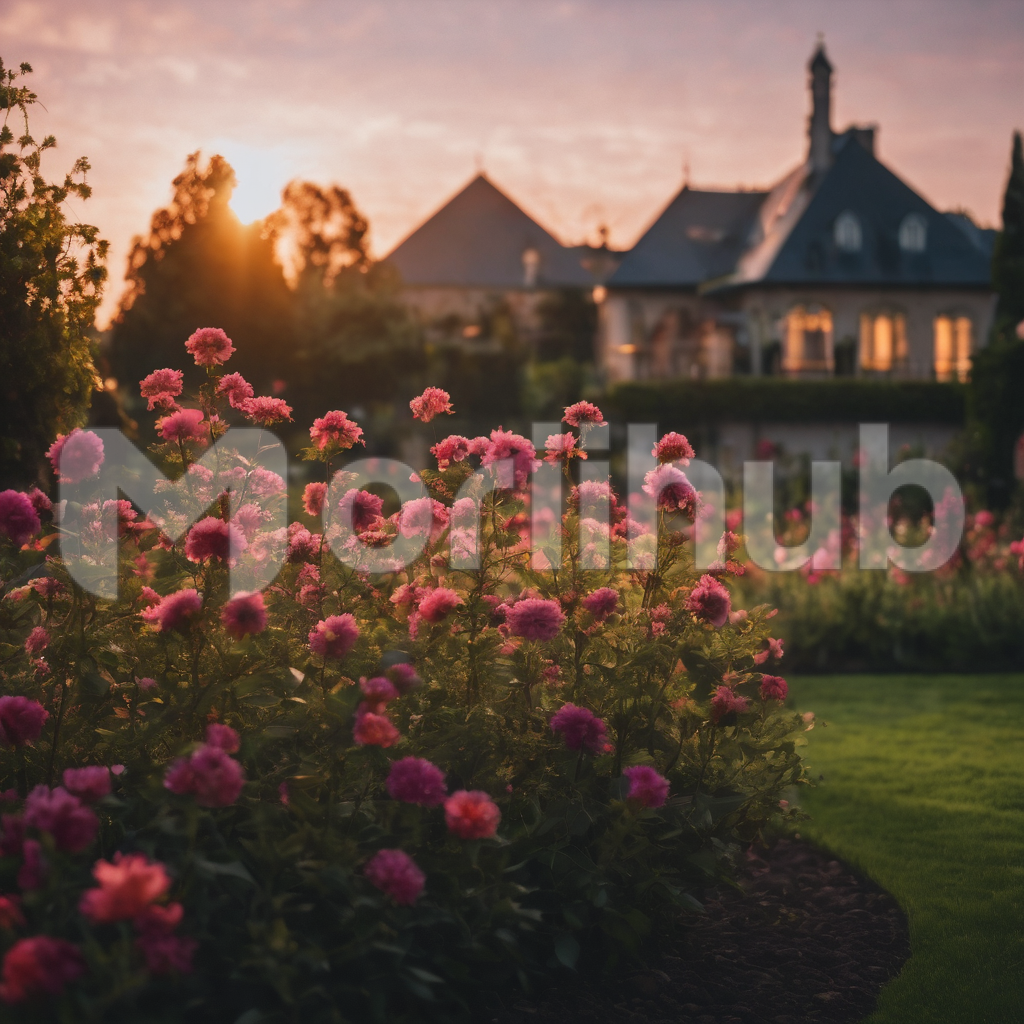 In the enchanting garden, vibrant blooms paint a kaleidoscope of colors, their fragrant petals swaying in the soft breeze. A charming house stands at the forefront, embraced by the floral abundance, its windows gleaming in the warm, golden light of the setting sun. As day transitions to night, the garden becomes a realm of tranquility and beauty, a picturesque haven where nature and architecture blend in a serene symphony under the gentle sunset hues.