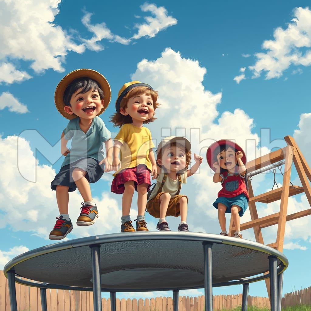A group of kids bounces joyfully on a high trampoline, their laughter filling the air. With each leap, they soar higher, faces full of excitement and thrill. The bright sky above and soft ground below add to the fun as they bounce and giggle, enjoying the feeling of weightlessness and freedom.