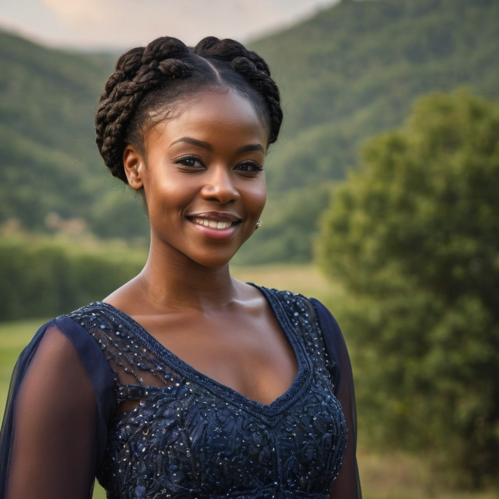 Bathed in nature’s embrace, a beautiful black woman stands with an enchanting smile, her hair elegantly braided. Graceful and radiant, she embodies a serene presence amidst the surrounding greenery. Each braided strand is a testament to both beauty and strength, reflecting the harmonious blend of natural splendor and the captivating essence she brings to the tranquil scene.