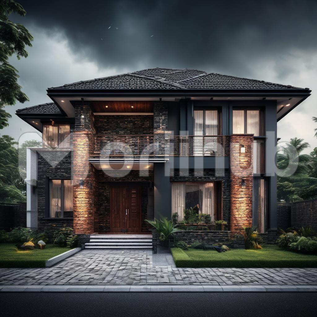 The modern bungalow exterior showcases a striking combination of sleek architecture and rustic brick design. The clean, horizontal lines of the structure are complemented by the textured brickwork, offering both warmth and sophistication.