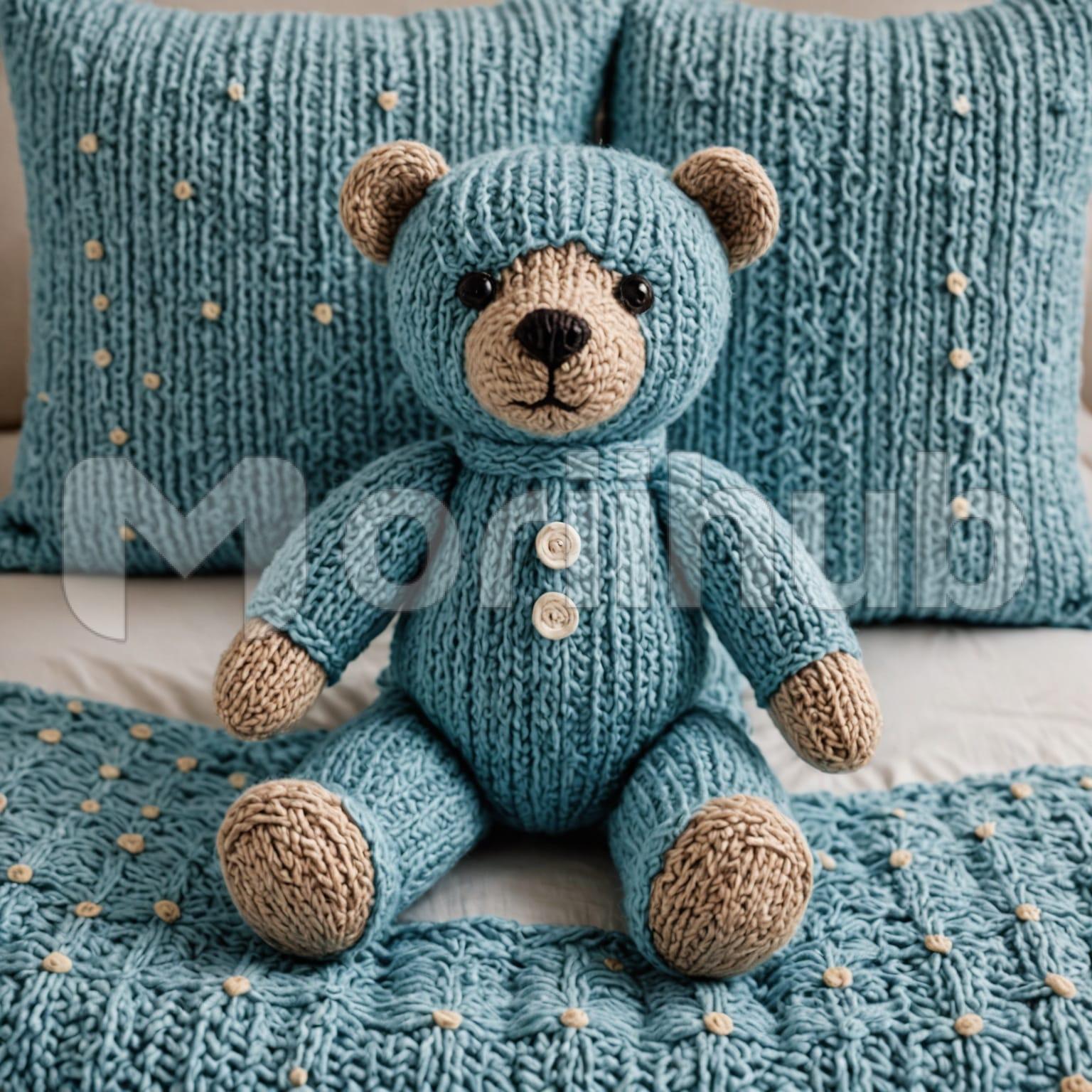 A knitted bunny rests on the bed, its yarn body slightly slouched as if it’s been carefully placed there. The long ears droop gently, and its stitched eyes are calm, fixed ahead. The bunny’s posture is relaxed, as if it has been waiting quietly for someone to notice. The tightly knit texture gives it a comforting, soft appearance. It blends into the bed’s softness, feeling both simple and cherished, like a quiet companion nestled among the folds of the sheets.