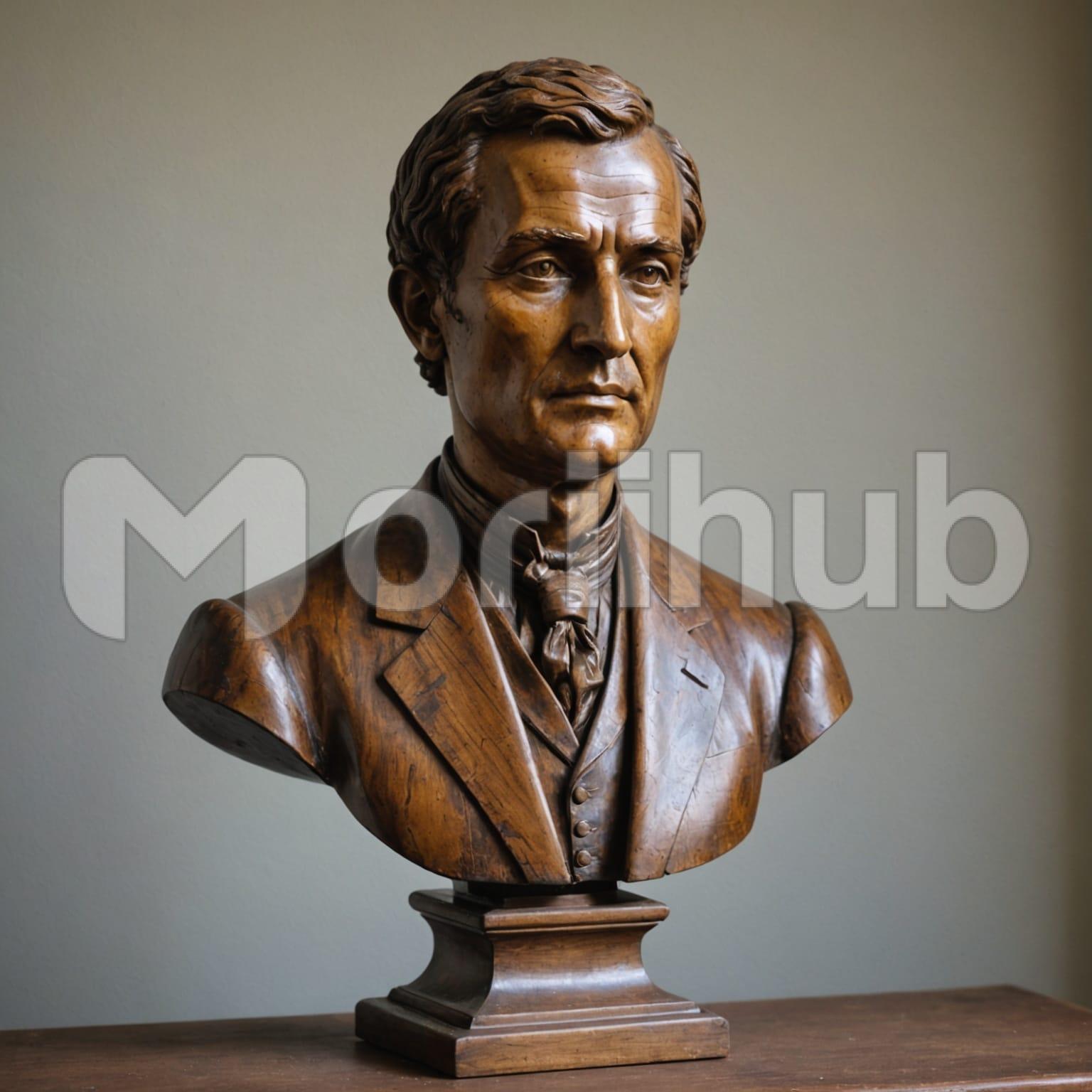 A bust of a man rests on the table, its sculpted form capturing the lines of the face with precision and depth. The features are defined yet balanced, suggesting thoughtfulness and quiet strength. The contours are smooth, while subtle details add texture and realism, reflecting careful craftsmanship. Positioned firmly, the piece becomes a focal point, standing with understated elegance. The table beneath provides a plain surface that emphasizes the bust’s presence, allowing its artistry and character to take center stage in the setting.