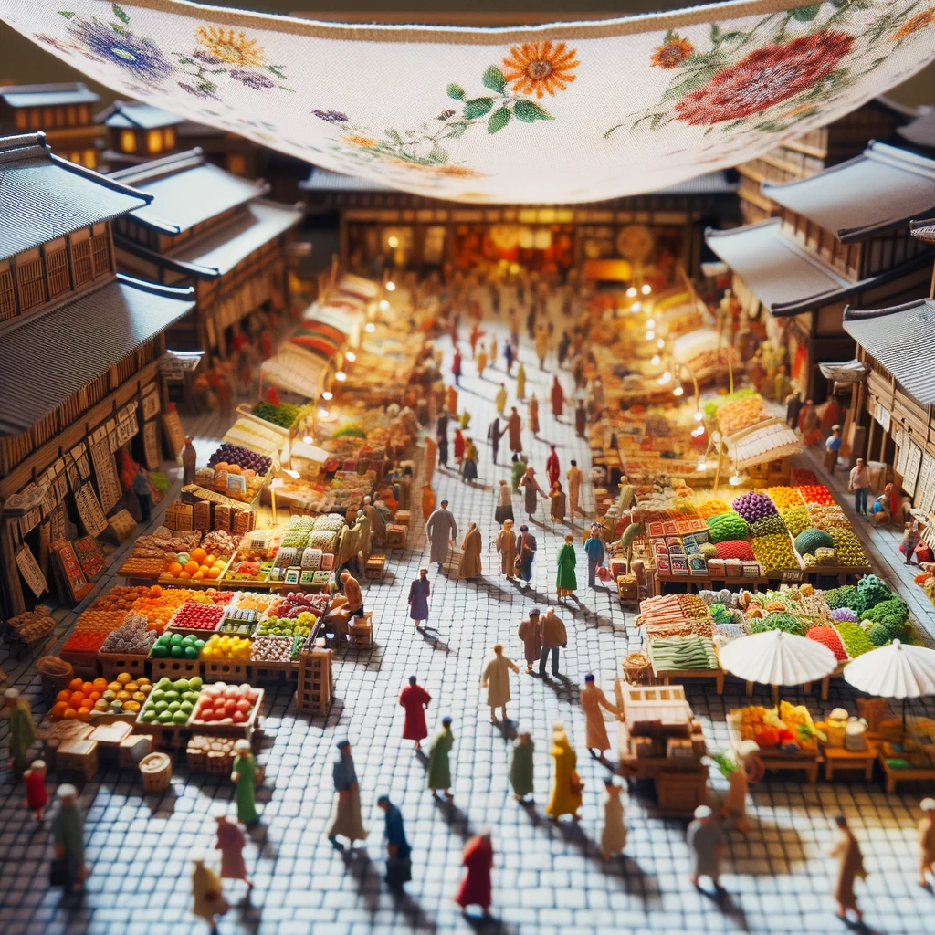 In this meticulously crafted miniature model, a bustling market scene bursts with life and detail. Tiny stalls adorned with colorful awnings line narrow streets, each overflowing with miniature produce and goods. Tiny figures bustle about, haggling over prices while the aroma of street food wafts through the air, creating a lively and immersive tableau.