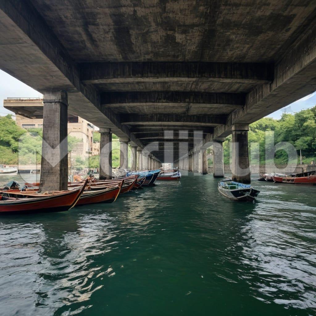 Beneath the bridge, a vibrant scene unfolds with numerous local boats gliding through the water. The boats, painted in bright hues, are busy with fishermen and vendors, creating a lively atmosphere. The bridge above provides a stunning view of the bustling river, where life flows in harmony with the water’s rhythm.