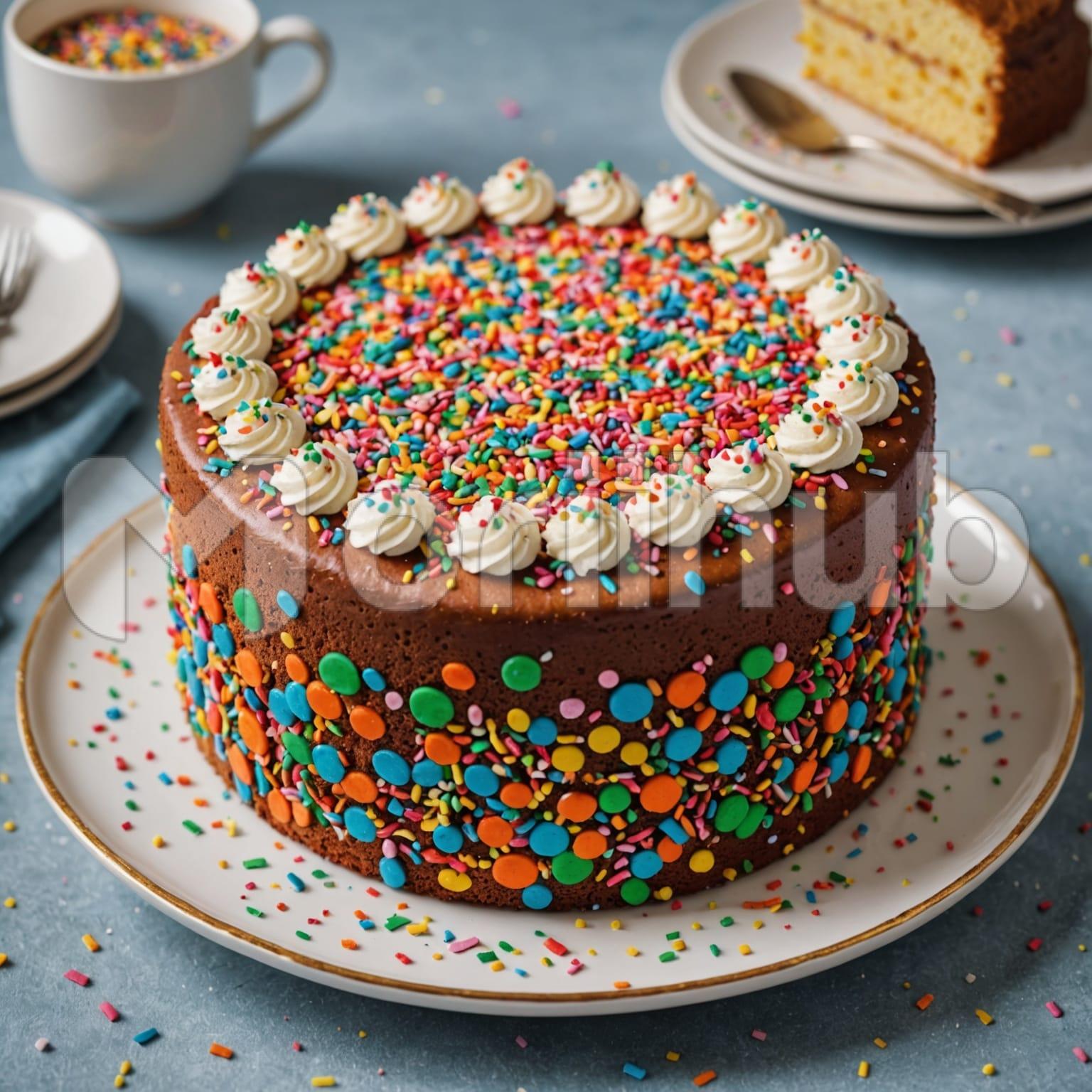 A cake sits on a plate placed on the table, its surface smooth and carefully presented. In the corner, another plate is visible, carrying a single slice removed from the whole. The slice rests neatly, edges defined, while a spoon lies beside it, positioned as though ready to be used. The arrangement creates a quiet sense of order, drawing attention to the contrast between the complete cake and the served portion. Together, they suggest sharing, enjoyment, and the simple anticipation of tasting something sweet.